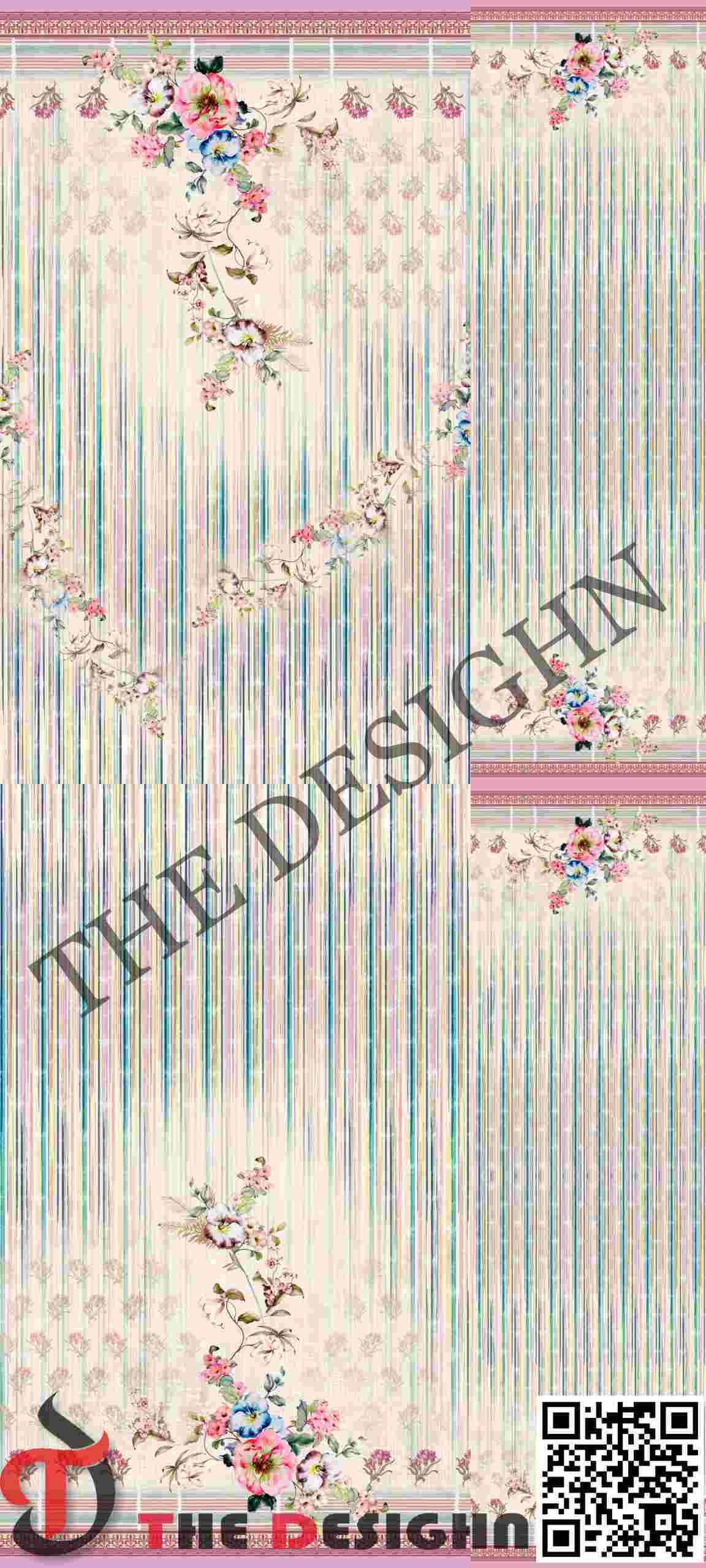 Pigment Dispersion (Zonal): The design features “Crystalline Linear Graduation.” Dispersion is strictly organized by “geometric containment.” The vertical pinstripes exhibit maximum, 100% opaque saturation, immediately transitioning to zero-saturation at their crisp perimeters. The floral specimens exhibit maximum saturation in their centers, transitioning to a “scumbled” lower density at the petal edges to mimic a soft, natural glow typical of high-quality reactive dyes.