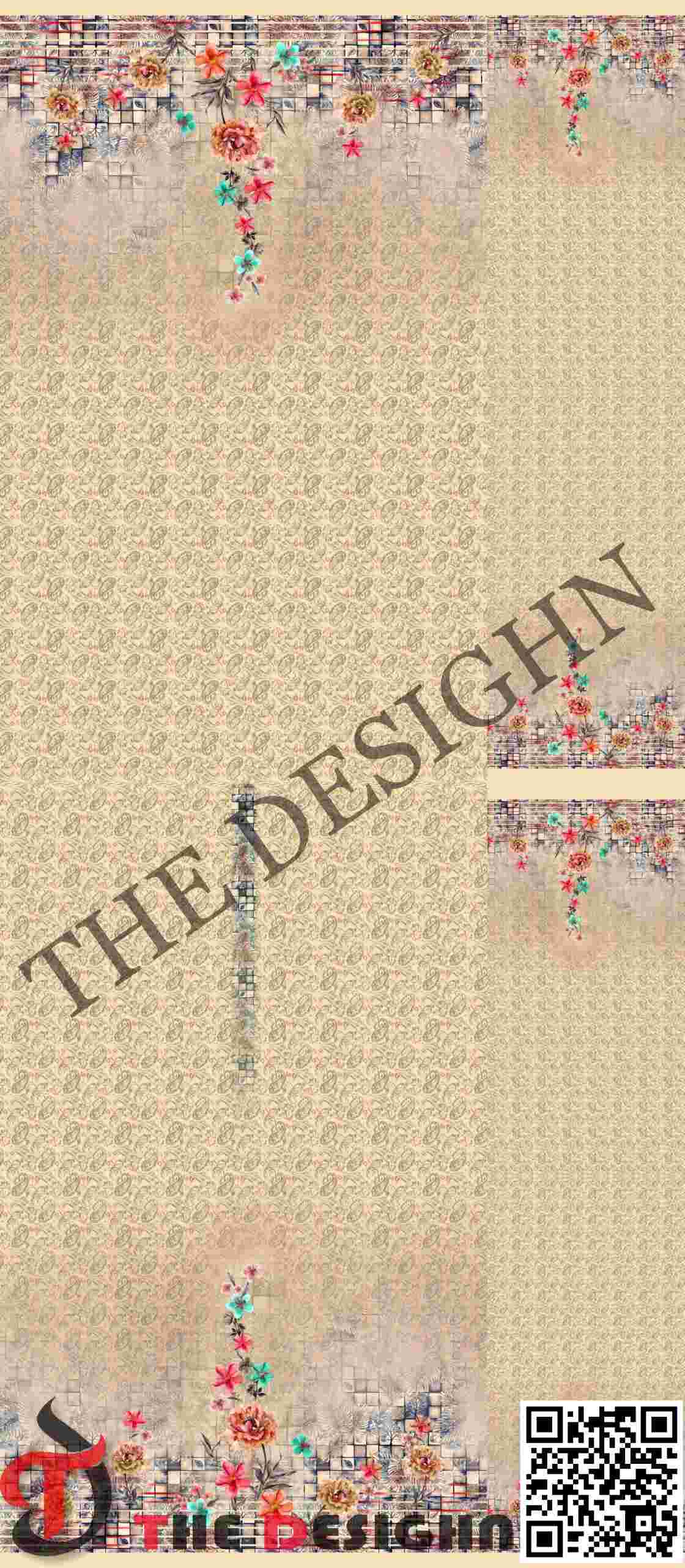 Architectural Borders: A mosaic grid pattern provides a structured transition between the floral borders and the main body. This geometric detail uses neutral “stone” colors and a grid-like arrangement to ground the organic flow of the botanicals.