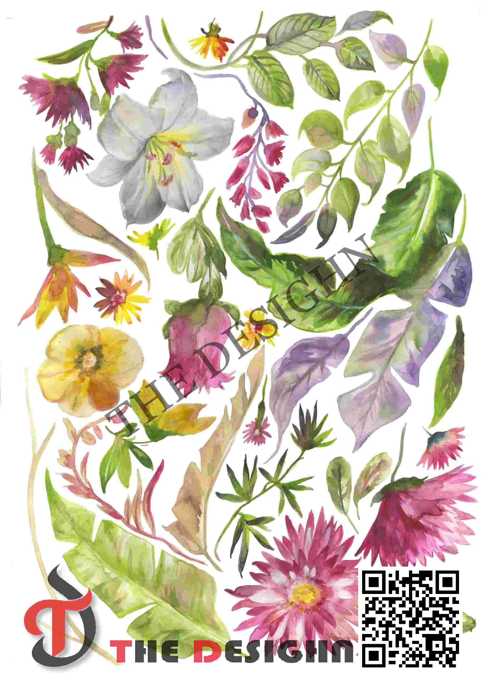 Pigment Dispersion (Zonal): The design features “Viscous Zonal Graduation.” Dispersion is strictly organized by the “radial” structure of the blooms and the “ribbed” structure of the leaves. The color exists in a state of high-density saturation at the base of the stems, immediately transitioning to a lower density and higher transparency at the tips, mimicking the natural movement of liquid pigments meeting a drying mineral surface.