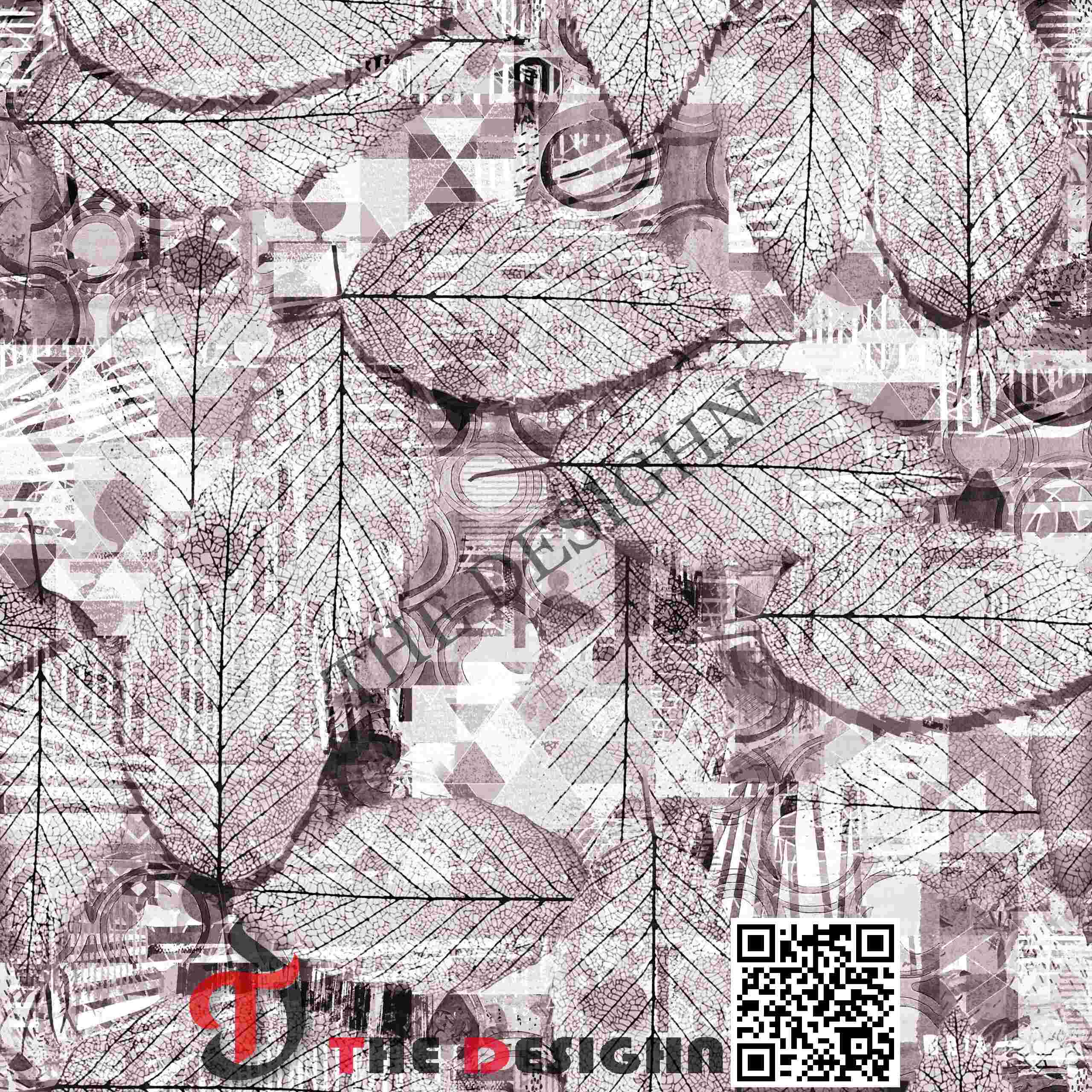 Pigment Dispersion (Zonal): The design features “Isolated Zonal Concentration”. Saturated amethyst and plum pigments are dispersed in dense, singular pockets within the leaf margins, immediately surrounded by highly transparent, “ghosted” washes that allow the underlying geometric textures to remain visible.