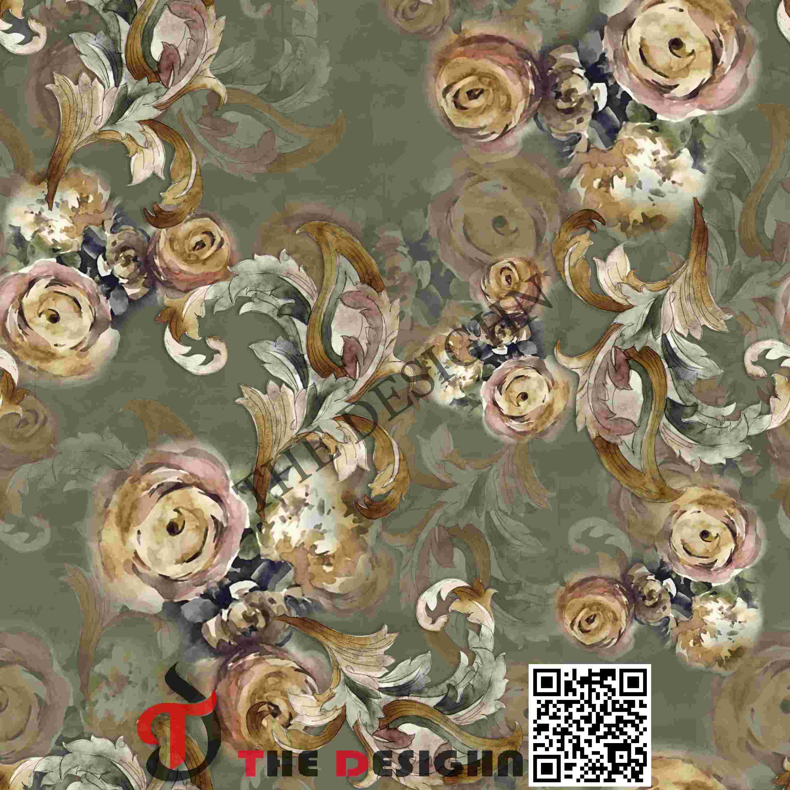 Visual Dispersion (Tonal Mottling): The background and rose petals exhibit “Abrasive Tonal Mottling.” The sage and olive pigments are dispersed in uneven, slightly grainy clusters, suggesting a hand-painted application where the color has settled deeply into a textured, artisanal surface.