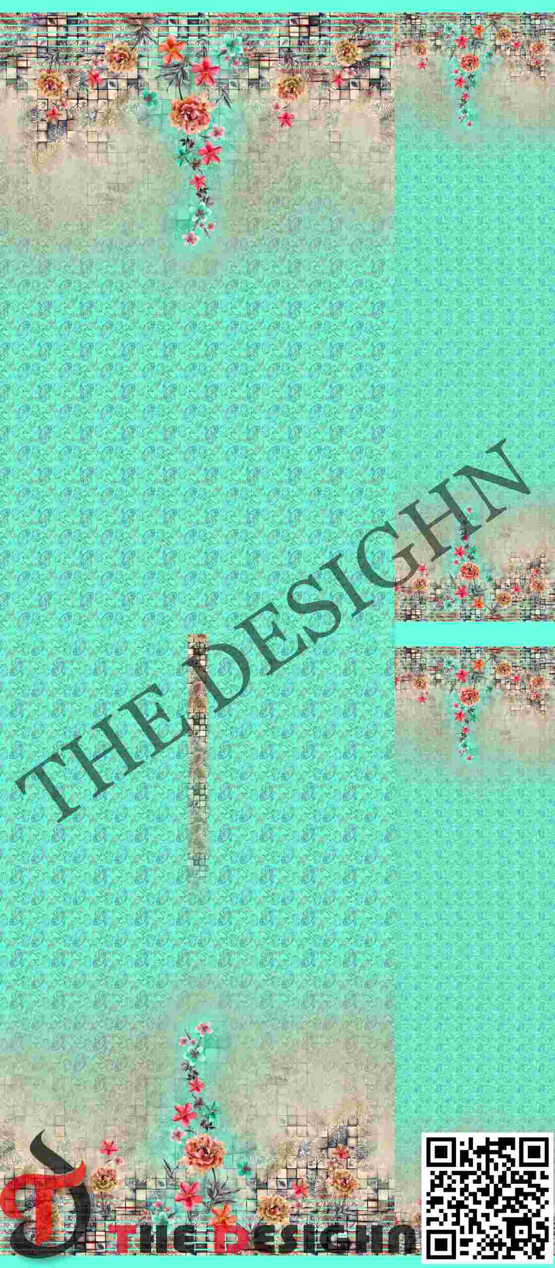 Botanical Borders (Daman & Neckline): High-definition floral sprays anchor the top and bottom of the panels. These feature lush peonies and carnations in warm coral and orange tones, punctuated by small turquoise blossoms that tie back to the main field color.