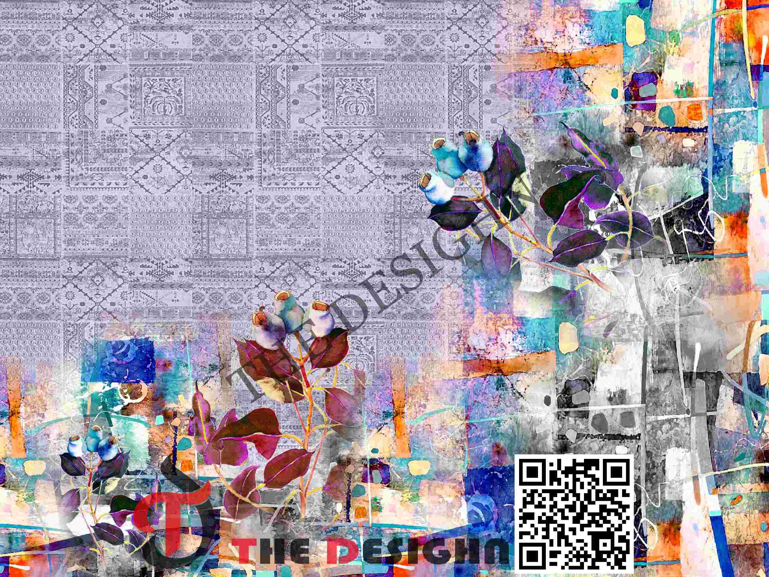 • Palette: Cool Mineral & High-Vibrancy Primary Tones: Soft Lavender and Grey background field, balanced by intense Azure Blue, Turquoise, and Burnt Orange within the abstract splatters, anchored by deep Purple and Teal foliage.