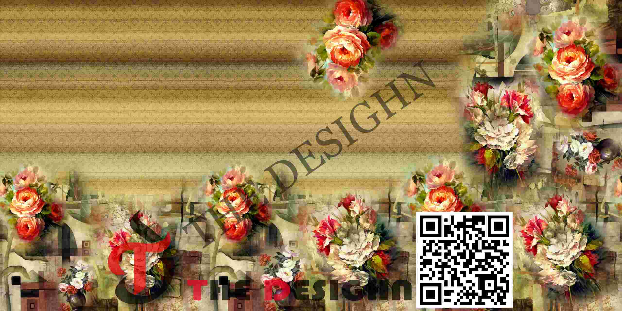 Pigment Dispersion (Graduated): The design features “Structural Block Graduation”. Within the masonry and floral zones at the base, the pigments are dispersed in sharp, distinct “cells” and soft-focus tonal shifts that transition rapidly from greyscale to high-saturation crimson, suggesting internal luminosity and 3D relief against the flat terraced pattern.