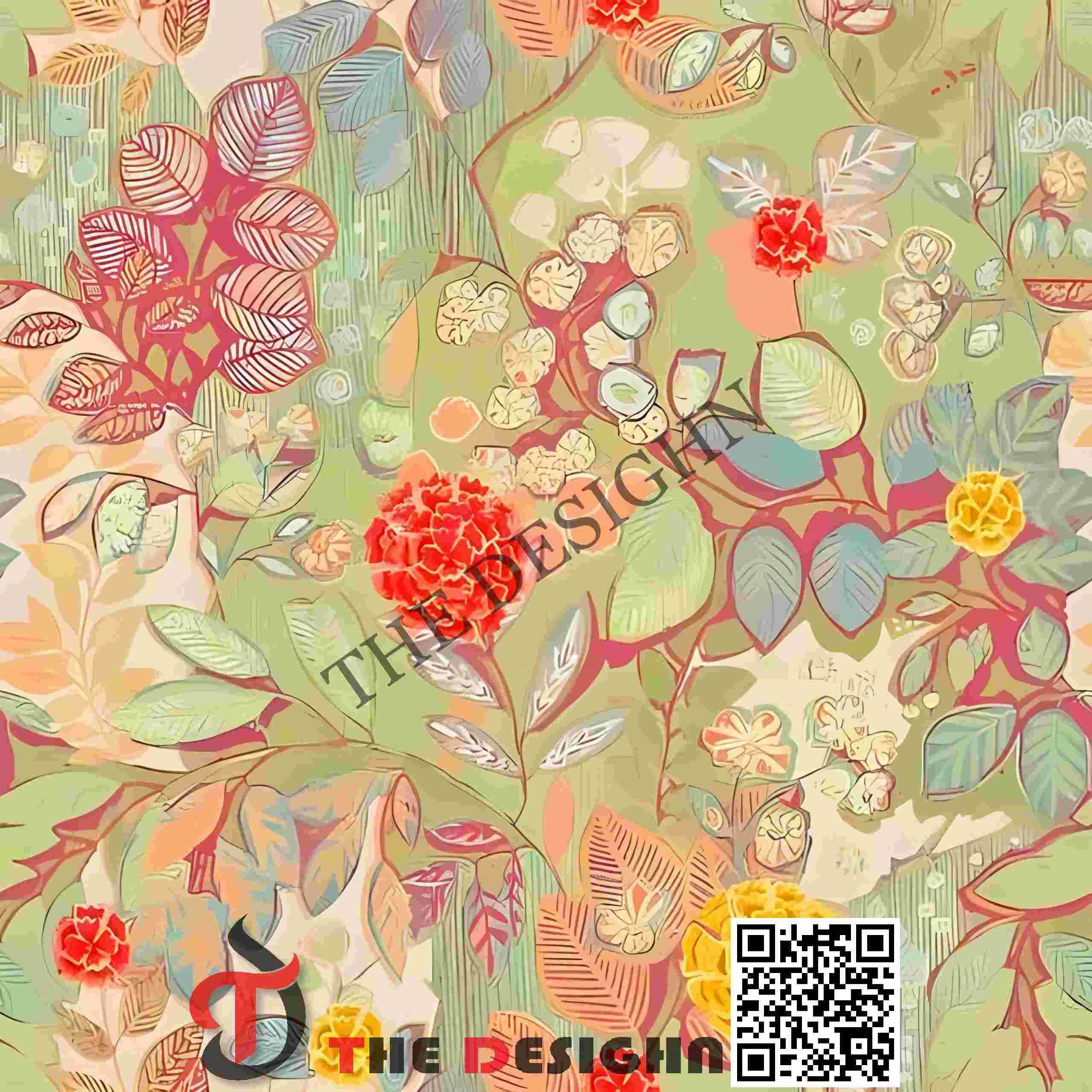 Pigment Dispersion (Segmented): The design features “Isolated Zonal Saturation”. Saturated rose and marigold pigments are dispersed in dense, singular pockets within the flower heads, immediately surrounded by wide areas of highly mottled, pale washes that simulate the physical behavior of ink on textured paper.