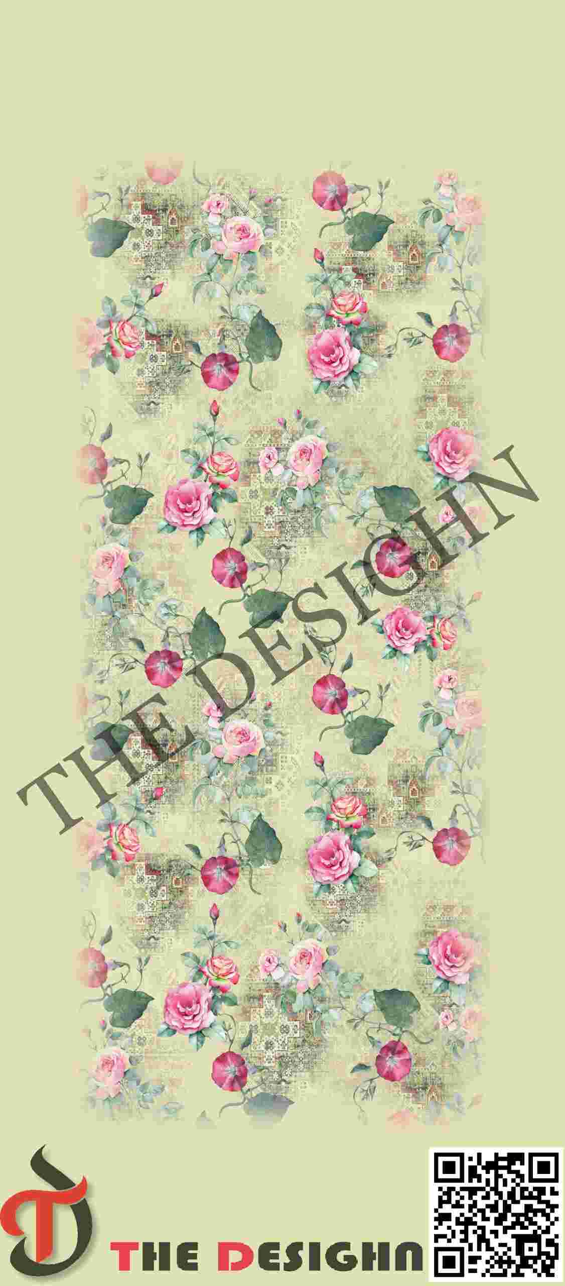 The Heritage Ground: The central canvas features a complex “shabby-chic” textured background. It is composed of faded, “ghosted” architectural filigree, geometric diamond lattices, and Persian carpet-style medallions in a muted lime and sand palette. This creates a weathered, historical depth that mimics an antique heirloom textile.