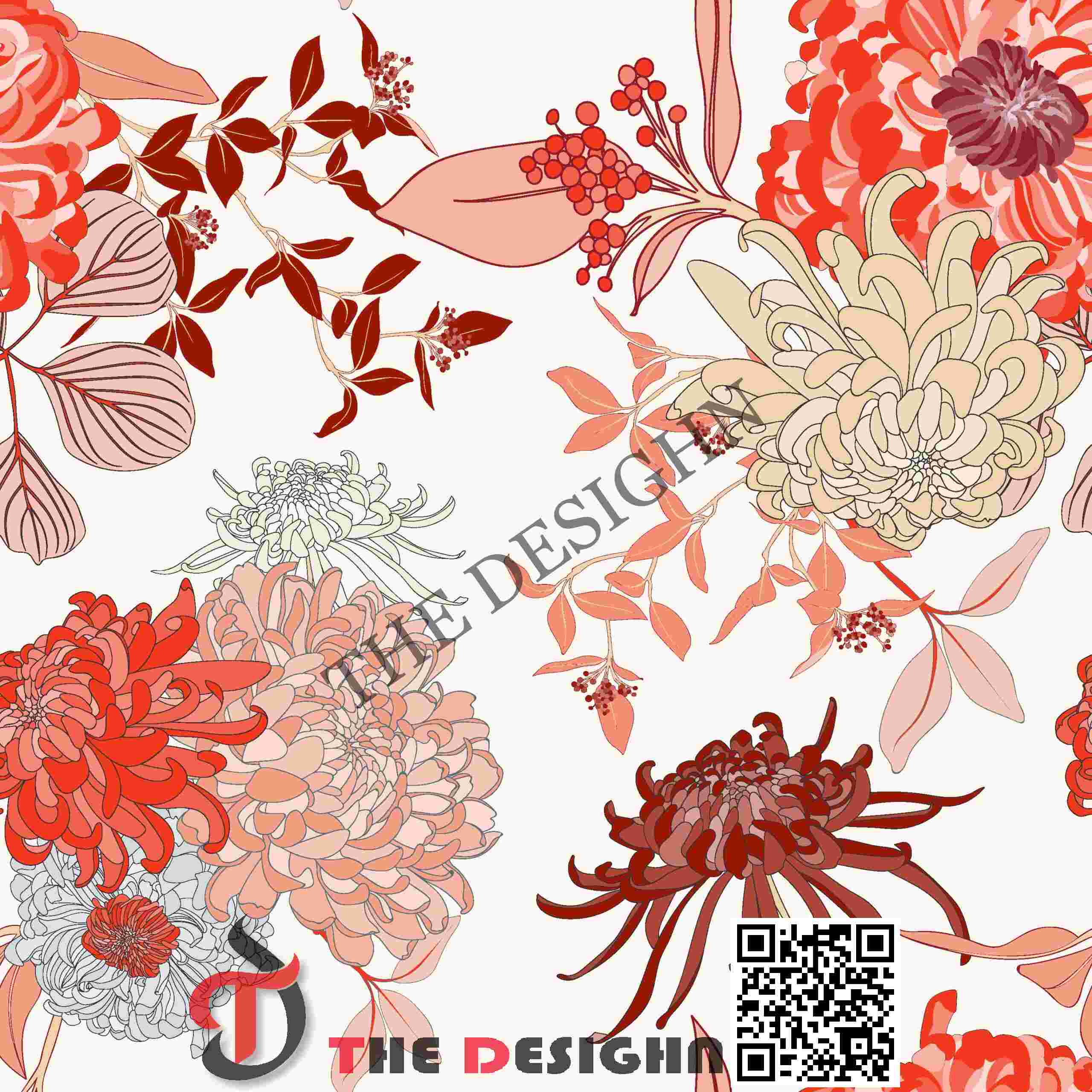 Pigment Dispersion (Isolated): The design features “Isolated Zonal Saturation.” Saturated crimson and coral pigments are dispersed in dense pockets within the primary blooms and berry clusters, immediately surrounded by wide areas of raw, creamy negative space that allow the motifs to “pop” without overlap.