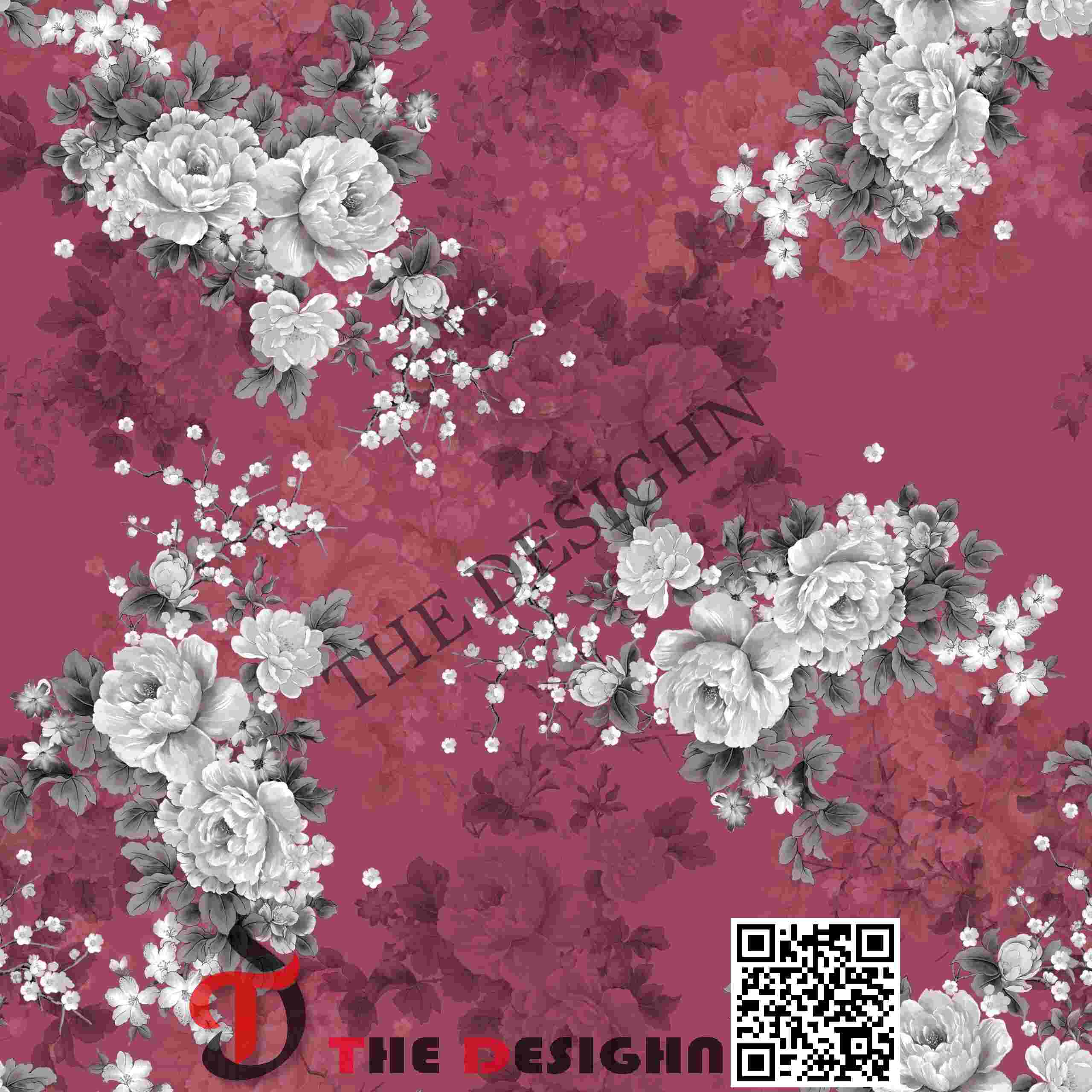 Edge Dispersion (Abrupt): The boundaries of the main grayscale forms feature “Abrupt Tonal Dispersion.” There is zero bleed between the white petals and the crimson background; the edges are razor-sharp, ensuring the complex floral silhouettes remain the primary architectural focus of the textile.
