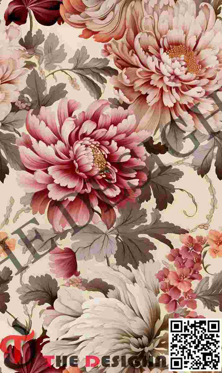 Visual Dispersion (Filamentous): The primary chrysanthemum forms exhibit “Centripetal Filamentous Volumizing”. Color and light are dispersed through thousands of rhythmic, hair-fine lines that fan out from the center of the blooms. This gives the flat print a tangible sense of 3D volume and internal light.