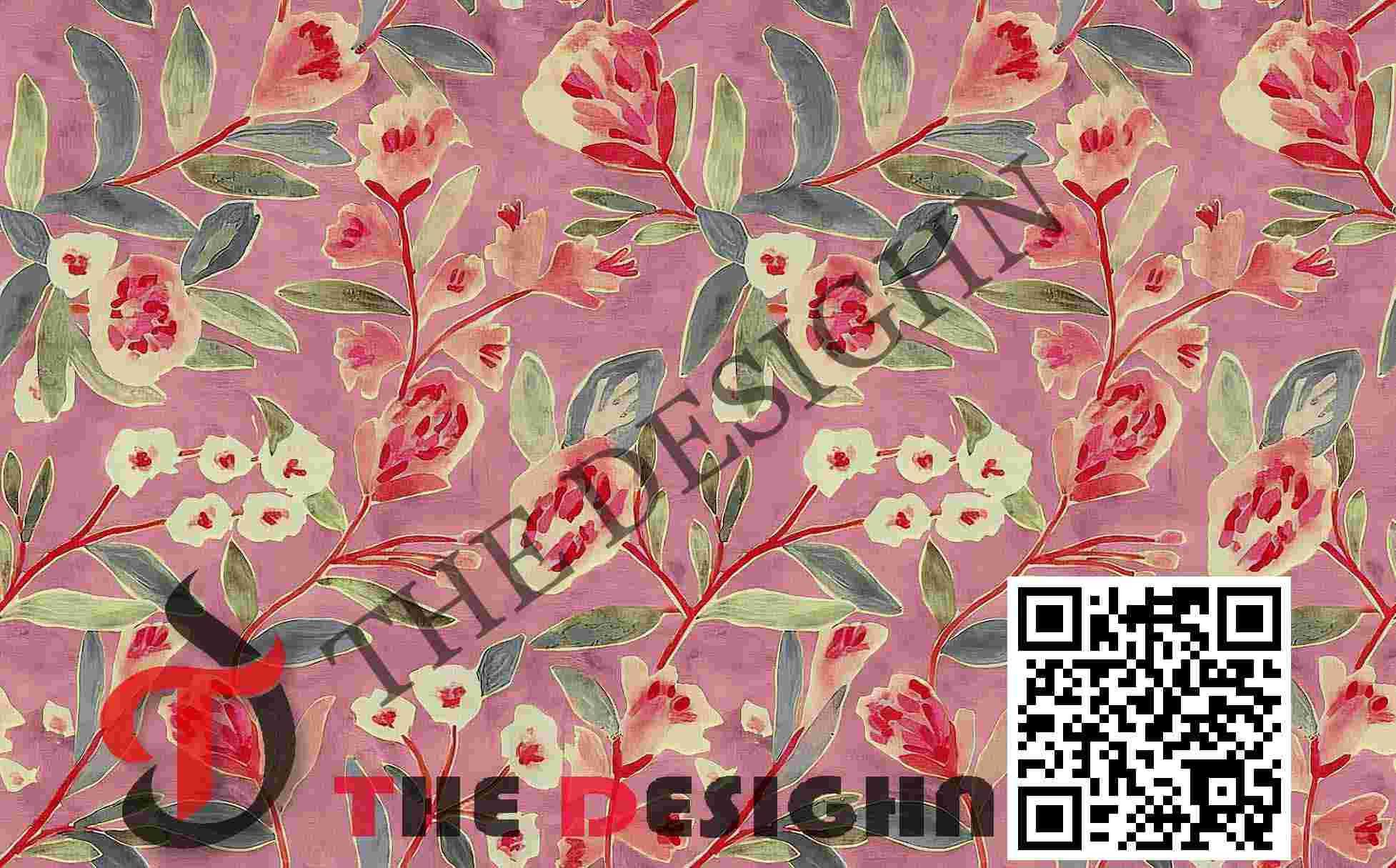 • The Look: The composition utilizes “Modular Branching.” Set against a deep, vibrant dusty-rose field, the design features diagonal stems of crimson and ivory blooms. The teal-gray leaves provide a cool, desaturated contrast, while the visible brushstrokes and internal shading provide a tactile, artisan quality.