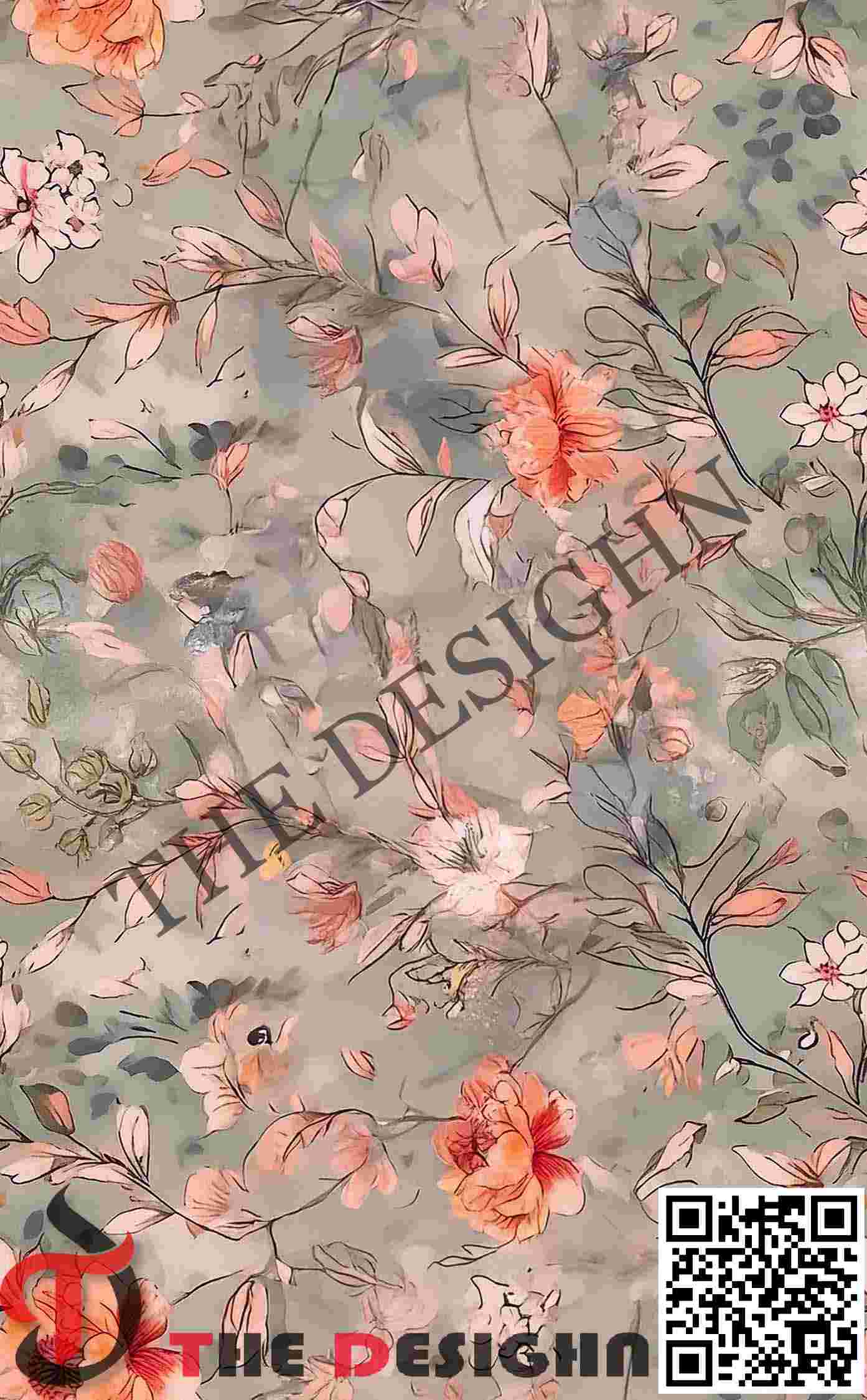 • The Look: The composition utilizes “Atmospheric Depth Layering.” Set against a mottled, desaturated sage-green field, the primary blooms in burnt apricot and soft peach feature intense internal hatching and needle-thin stems. “Ghosted” background foliage in smokey gray-greens provides a sense of dense, layered volume.