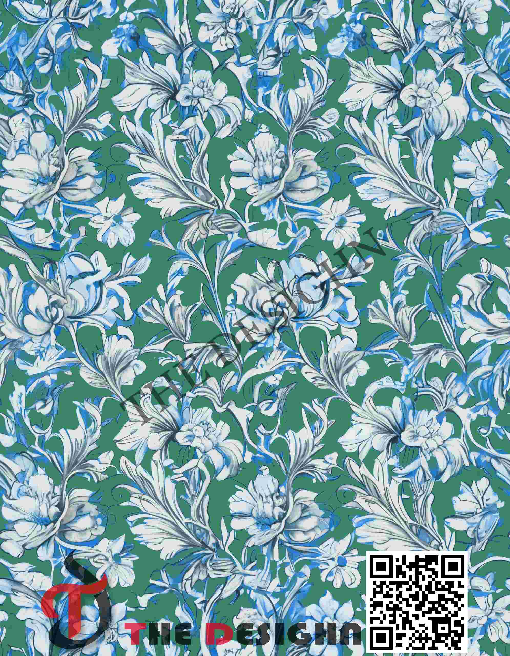 Visual Dispersion (Viscous): The darker blue and charcoal elements exhibit “Viscous Line Pooling.” The pigment is dispersed as if applied with a wet ink-pen, settling more heavily in the “joints” of the scrollwork and the base of the petals to create natural, self-shading “tide lines”.