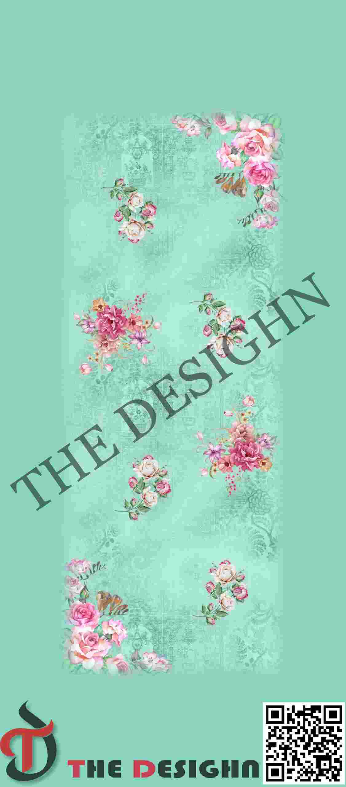 The Heritage Ground: The central field is a complex “shabby-chic” textured background. It features faded, “ghosted” sections of traditional South Asian medallions, geometric lattices, and architectural filigree in varying shades of mint and seafoam green. This distressed effect provides a historical, textile-rich depth that mimics an antique block-printed heirloom.