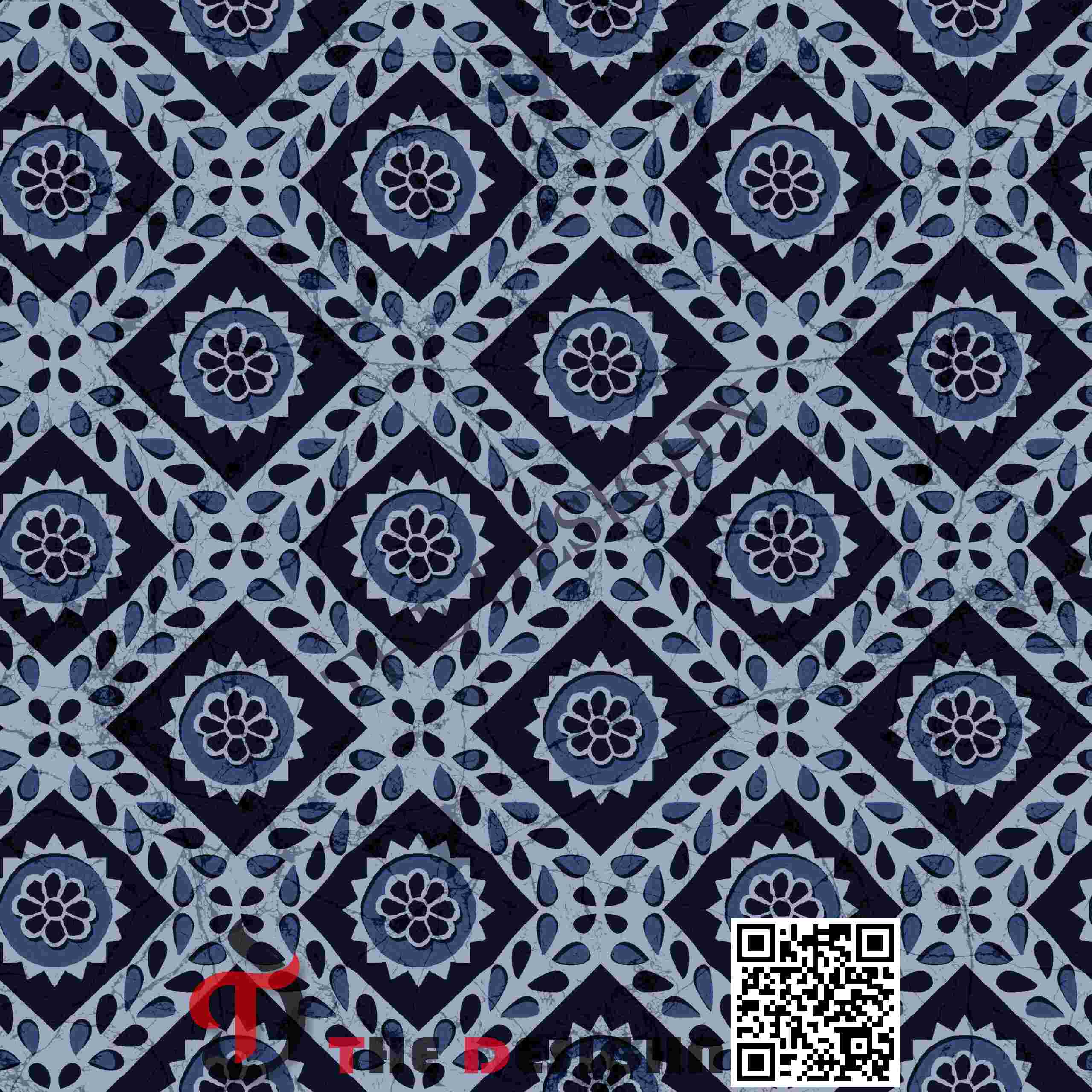 The color scheme is dominated by deep navy, slate blue, and soft gray-blue, giving the pattern a calm, sophisticated mood.