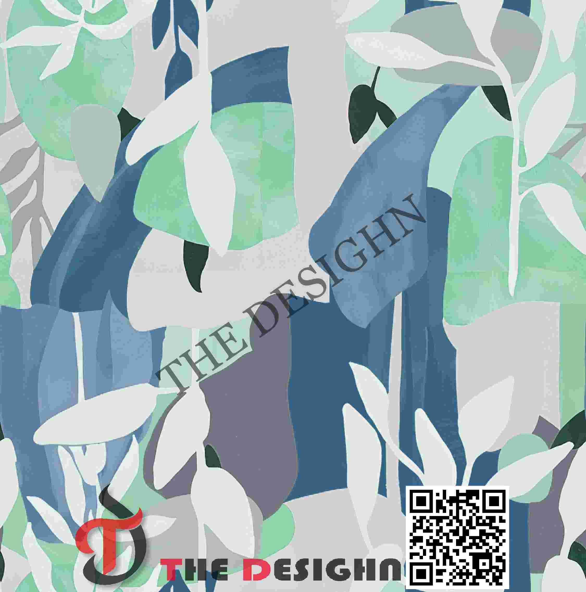 • The Look: The composition utilizes “Plane-Intersection Layering.” Set against a stark Glacial White field, the design features large, flat shapes of Cobalt-Blue, Mint-Green, and Slate-Gray. These organic masses are “stitched” together by delicate white stems and leaves, creating a clean, high-definition surface.