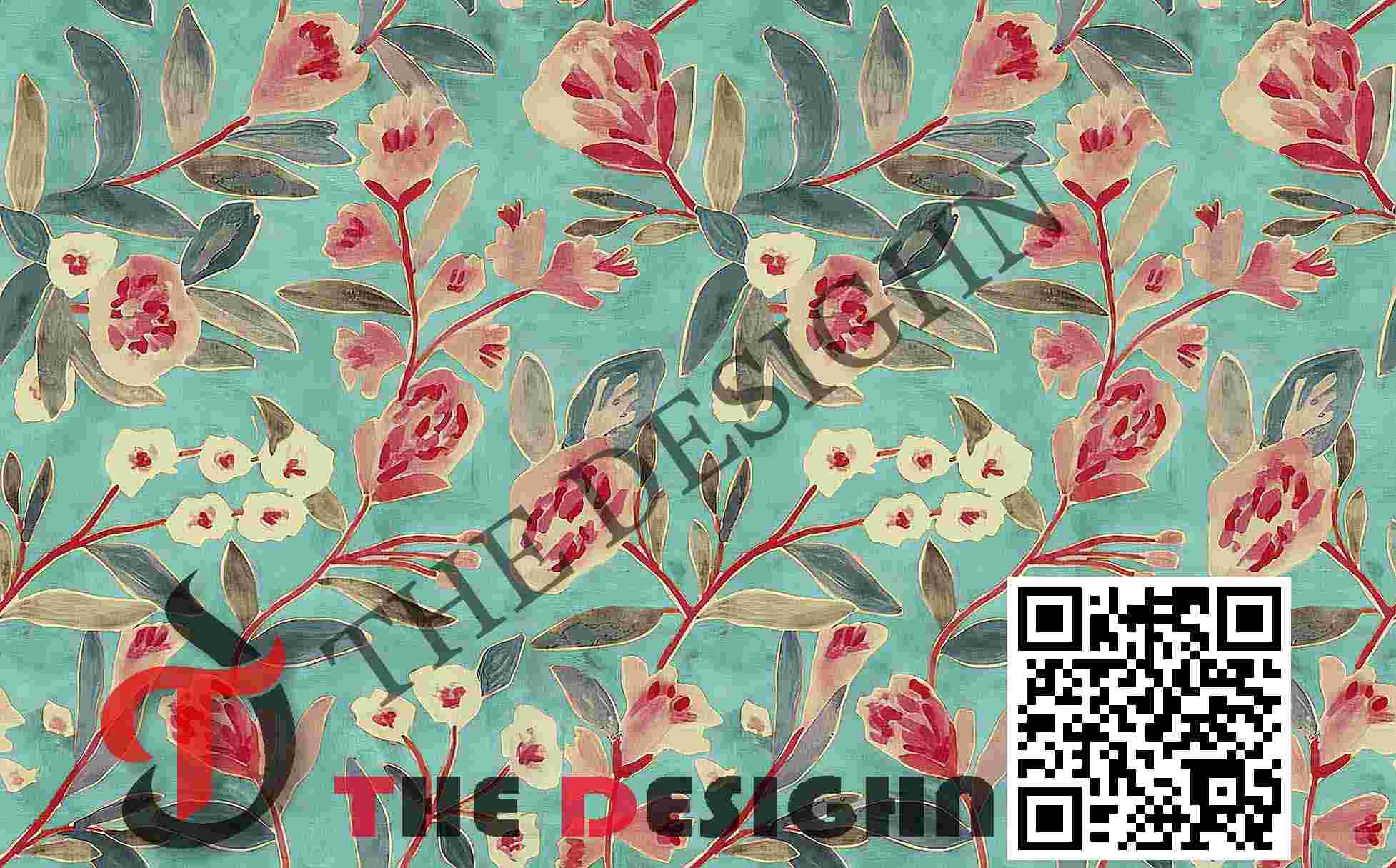 • Pigment Dispersion (Zonal): The design features “Viscous Zonal Graduation.” Within the rose-colored flower heads and teal leaves, the color is dispersed in varying “weights”—from high-density solid pigment to light, vaporous “dry-brush” streaks where the mint ground is visible—mimicking the natural drag of a brush loaded with thick paint across a textured surface.