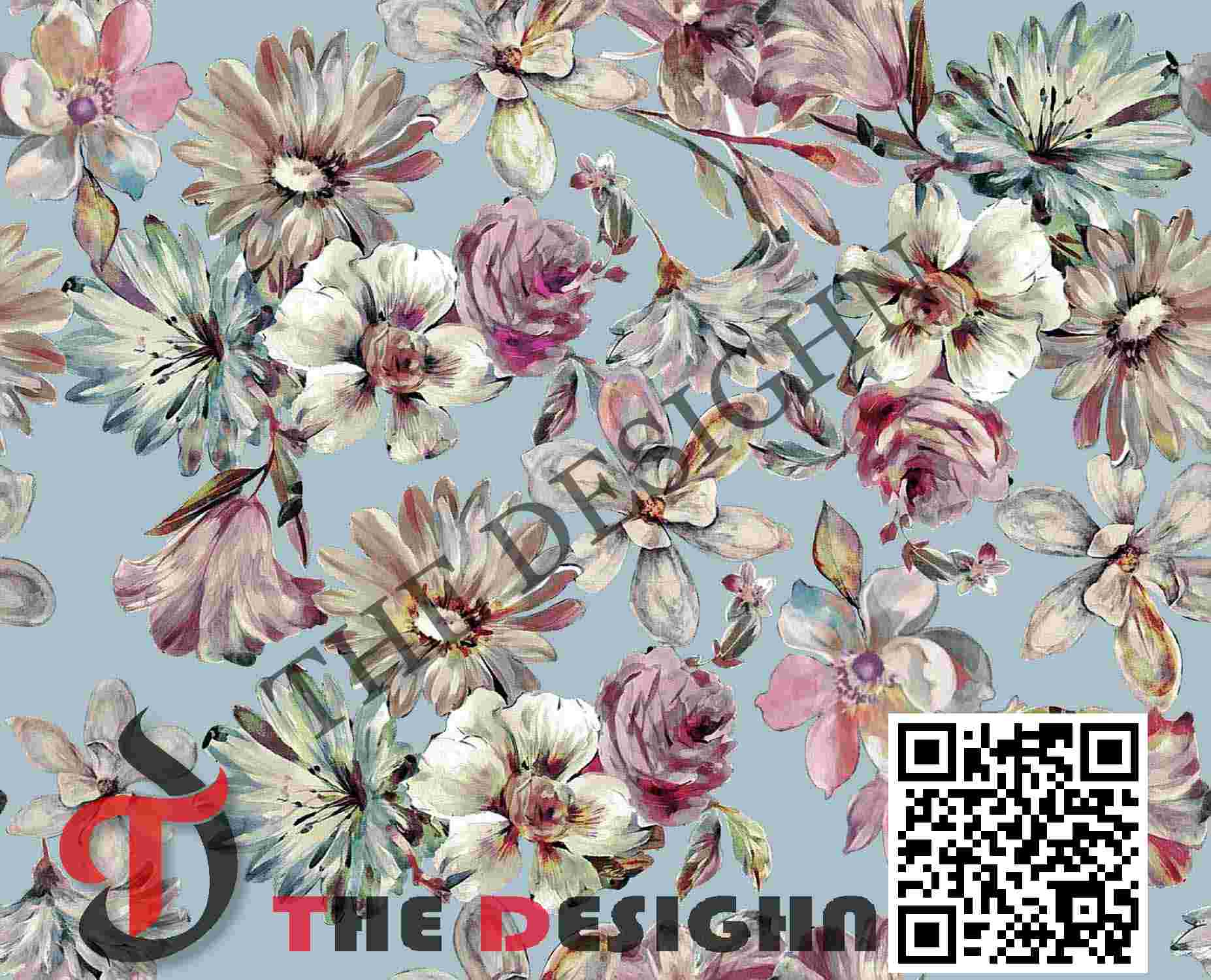 • The Look: The composition utilizes “Volumetric Overlapping.” Set against a solid, non-reflective Glacial Steel-Blue field, the flowers—ranging from wide-petaled daisies to tight rose clusters—are rendered with visible, “dry-brush” strokes. The contrast between the warm cream petals and the cool background creates a sophisticated “temperature tension.”