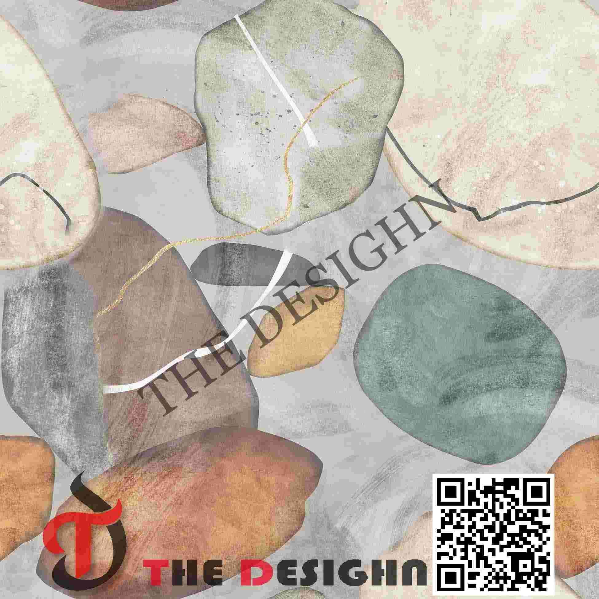 Pigment Dispersion (Zonal): The design features “Viscous Zonal Graduation.” Dispersion is strictly contained within the rounded perimeters of the stones. The color moves from high-density “cores” to light, vaporous “scumbled” edges where the mineral background is visible, mimicking the natural weathering of water-eroded stone.