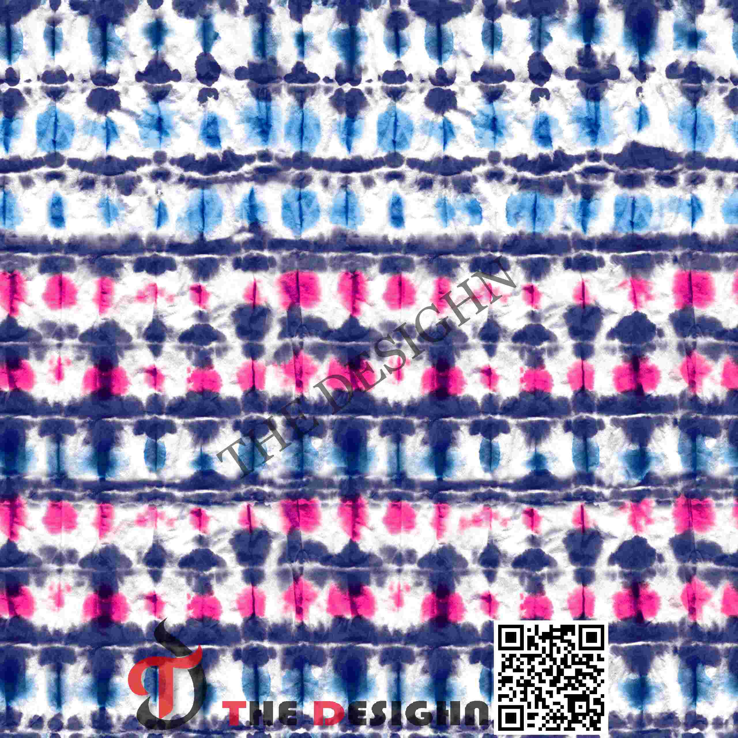 Pigment Dispersion (Segmented): The design features “Isolated Zonal Segmentation”. Saturated pigments are dispersed in dense focal points along the center of each horizontal band, immediately surrounded by a “halo” of lighter blue or pink as the pigment travels toward the resisted white margins.