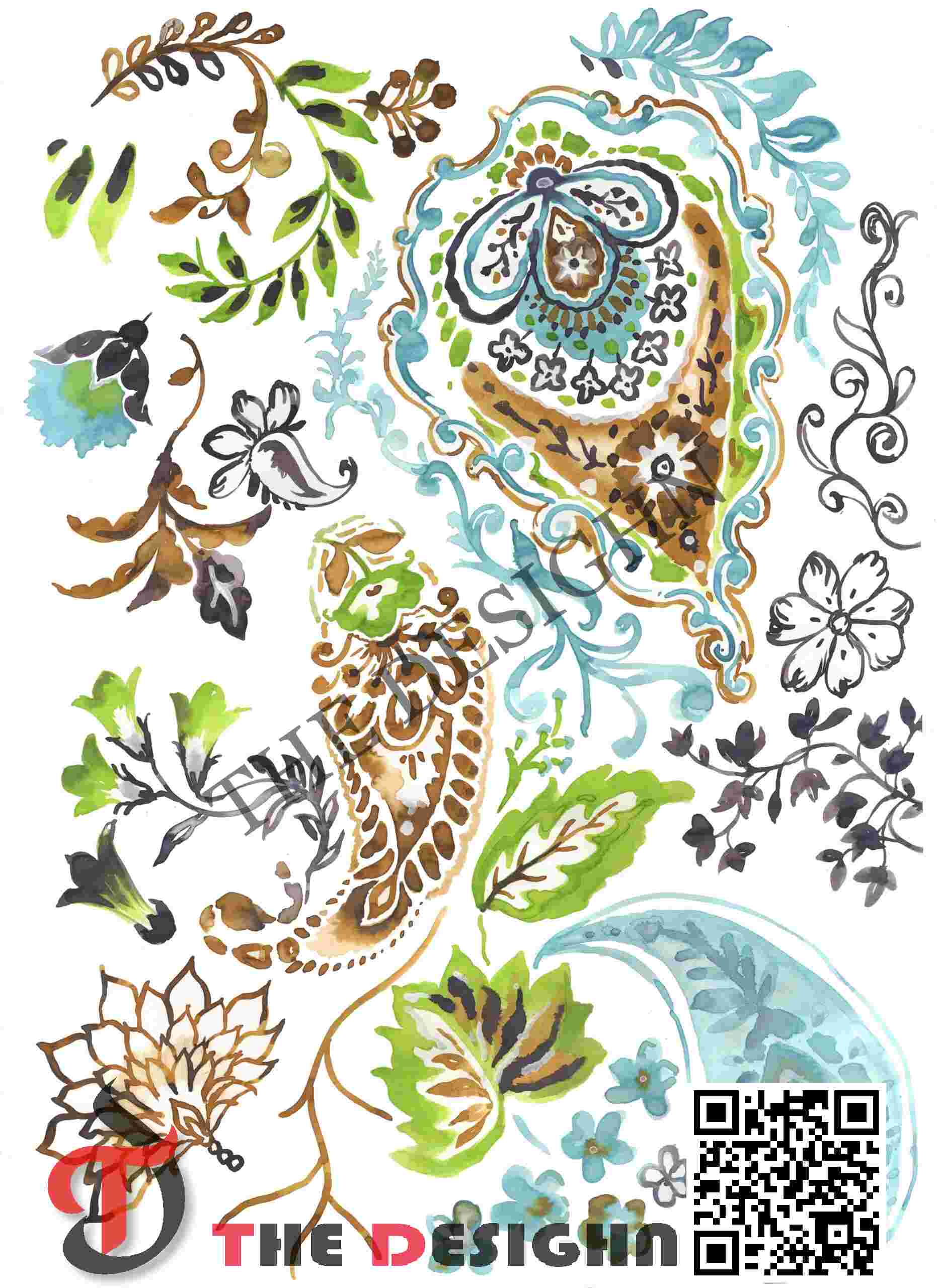 • The Look: The composition utilizes “Distributed Rhythmic Scaffolding.” Set against a brilliant Mineral-White field, the design features several paisley forms in varying states of saturation—from a dense, multi-tonal ornate piece (top-center) to a light, ghostly aquamarine wash (bottom-right). Secondary gestural leaves and “inked” vine silhouettes provide organic motion across the white space.