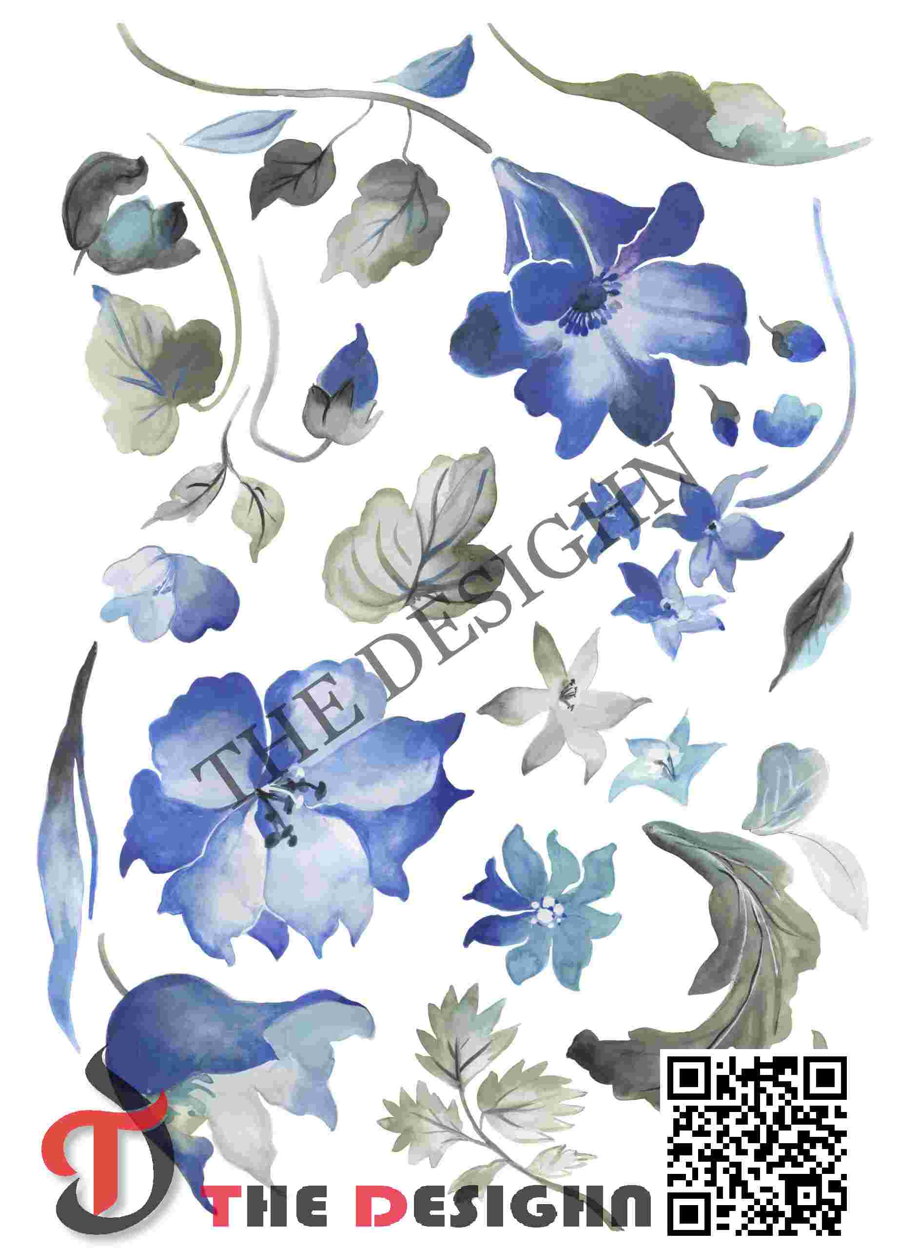 • The Look: The composition utilizes “Distributed Specimen Scaffolding.” Set against a brilliant Mineral-White field, the design is organized by cool-tone saturation: the primary focal points are three large, luminous blue blooms, while the perimeter is populated by secondary “ghosted” grey-scale leaves and delicate buds.