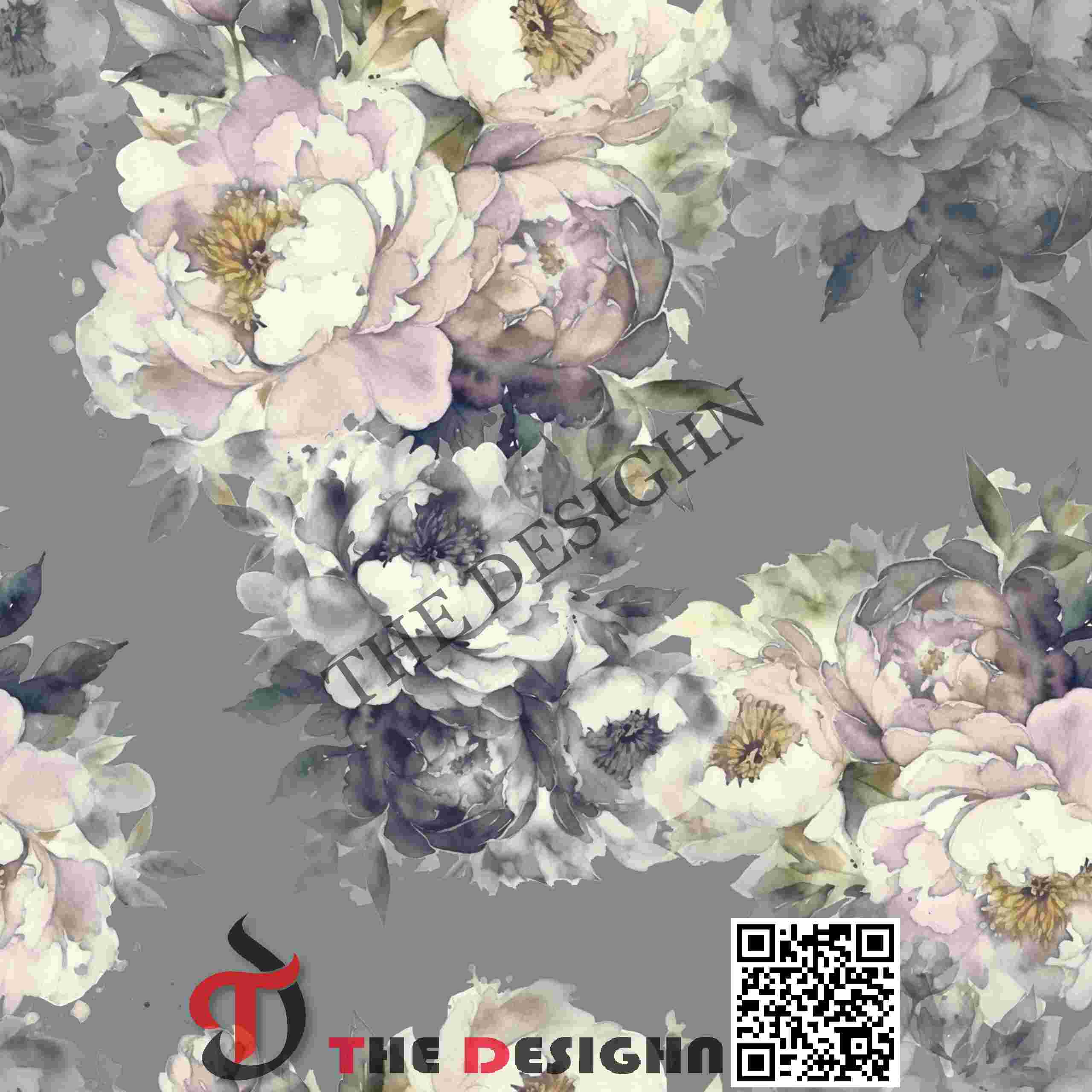 Visual Dispersion (Mottled): The primary white and grey peonies exhibit “Internal Tonal Mottling.” The pigment is dispersed in soft, uneven washes that suggest a “wet-on-dry” technique, where the color is most saturated at the petal base and fades into a nearly transparent, luminous edge.