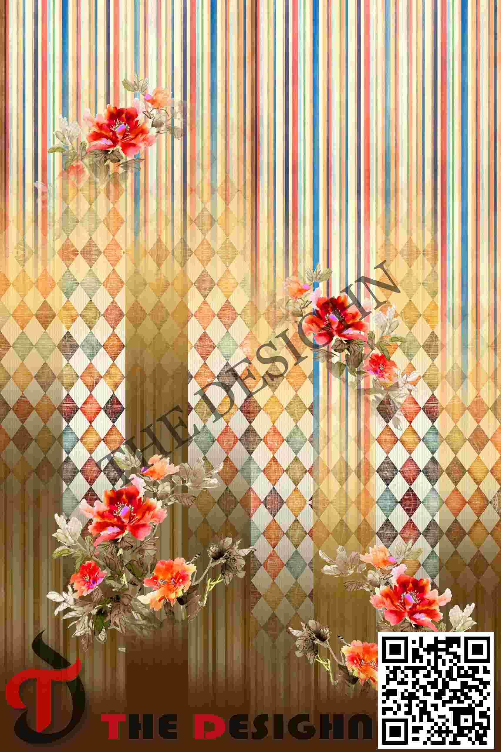 Edge Dispersion (Fractured-to-Crisp): The boundaries of the main forms feature a “Dual-Action Transition”. While the foreground poppy clusters maintain high-fidelity, crisp margins, the background diamond motifs and the transition between the stripes and the “scraped” field are dispersed with porous, feathered edges, ensuring the movement feels both spontaneous and grounded in a mathematical structure.