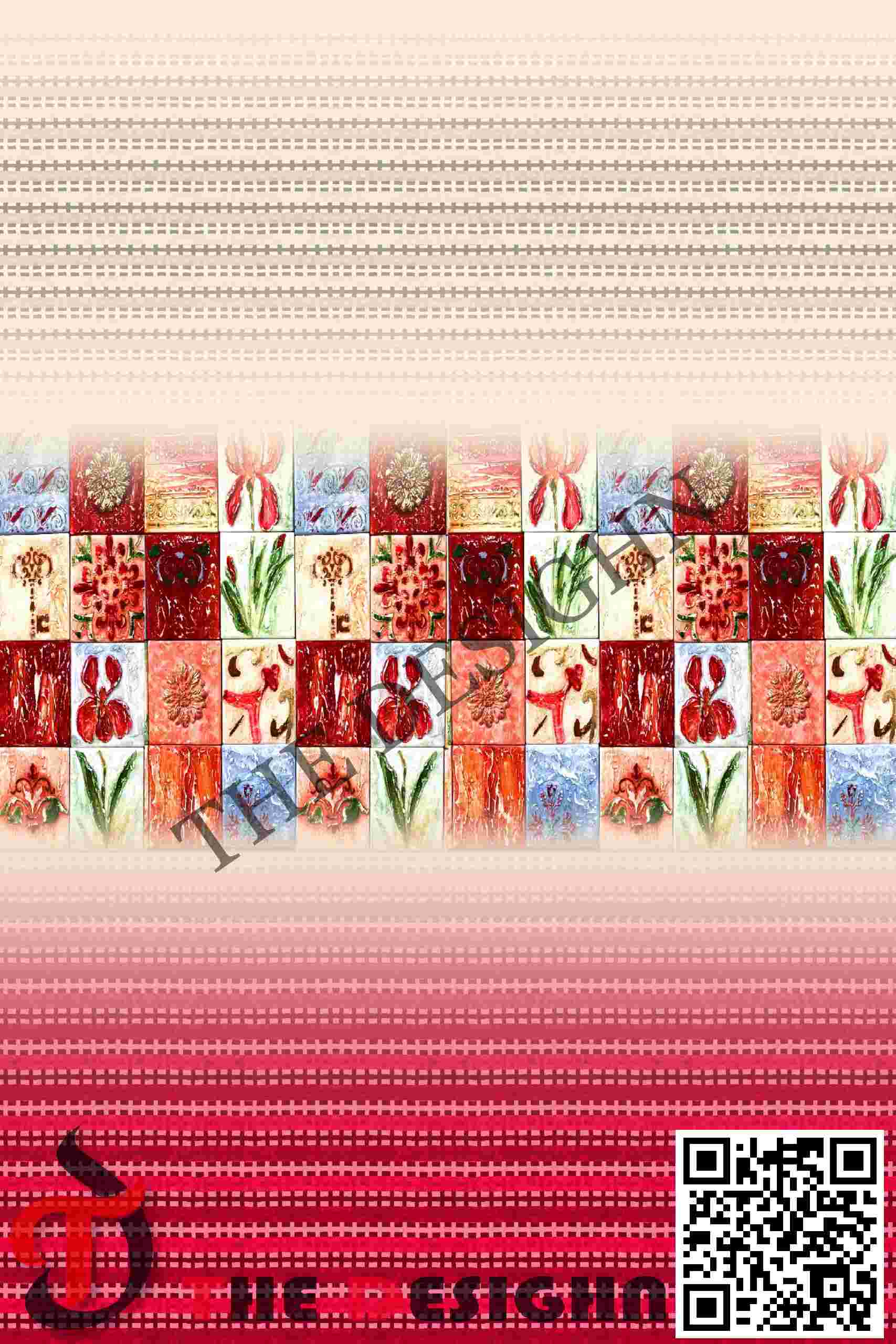 Pigment Dispersion (Graduated): The design features “Structural Block Graduation”. Within the central mosaic ribbon, the individual tiles (featuring iris flowers, keys, and sunbursts) use internal color dispersion that transitions from saturated center-points to soft, porous edges, suggesting 3D relief and hand-painted depth.