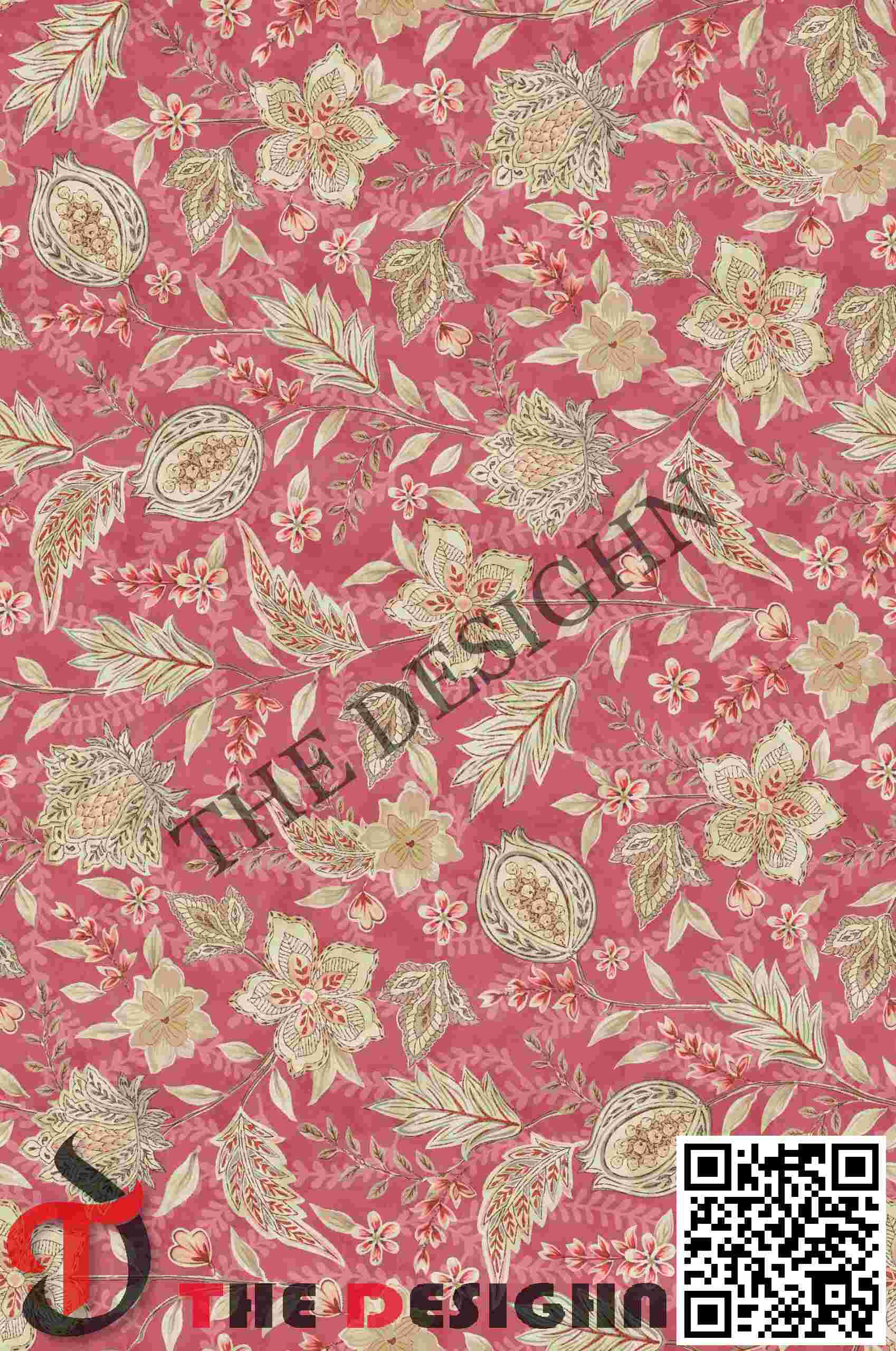 Pigment Dispersion (Zonal): The design features “Zonal Grain Graduation”. Within the internal petals and fruit pods, the color is dispersed in varying weights—from high-density cream to lighter, “vaporous” sandstone tints—creating a sense of physical material depth and 3D relief against the saturated crimson ground.