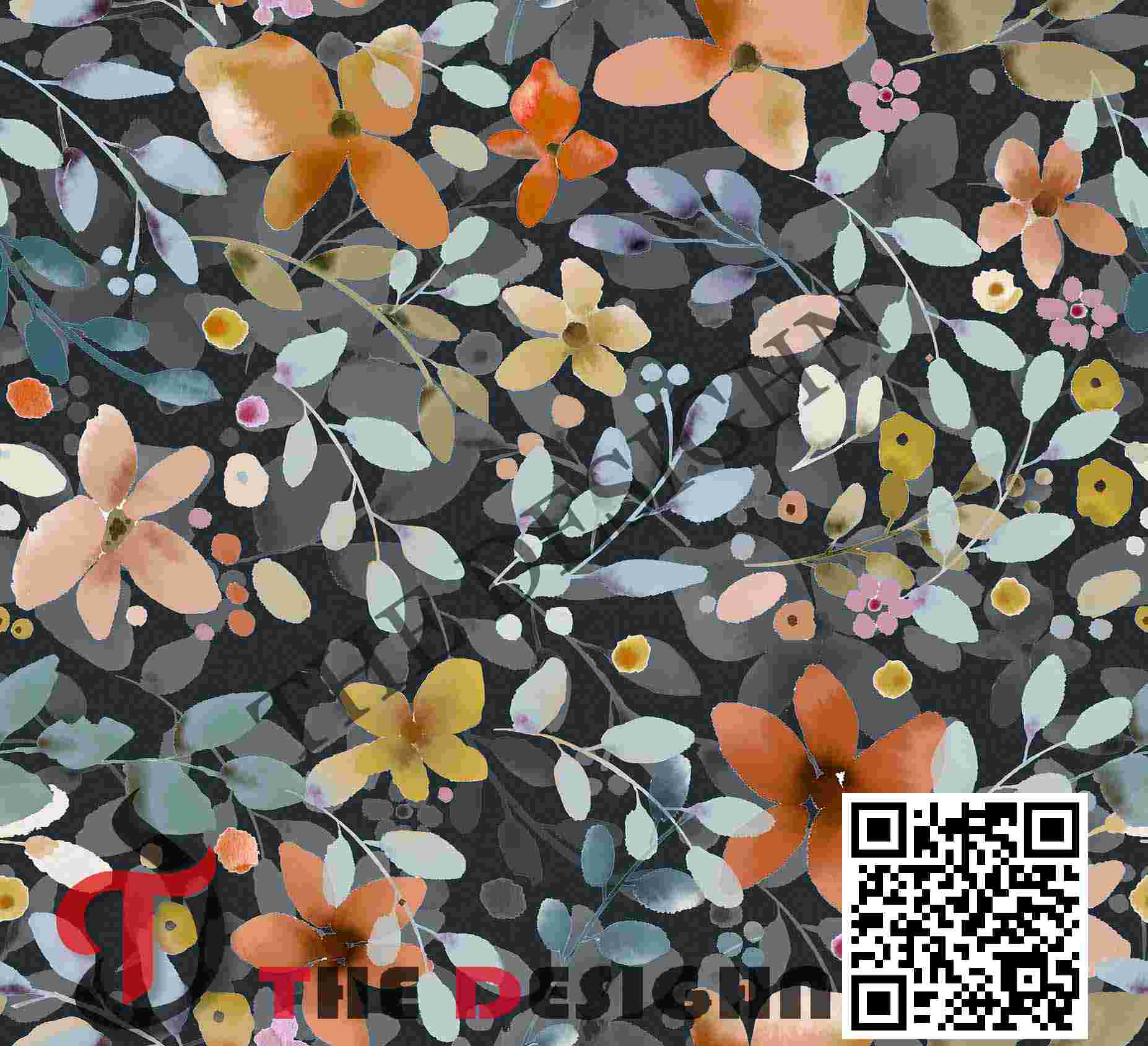 Visual Dispersion (Mechanical): The design exhibits “Aqueous Edge-Bleeding Dispersion.” The pigments within the flowers and leaves are dispersed in soft, translucent washes where the color “pools” at the perimeter, characteristic of Digital Watercolor or High-Dilution Ink. This provides a tactile “glow” surface quality where the forms appear to be floating on top of the dark ground.