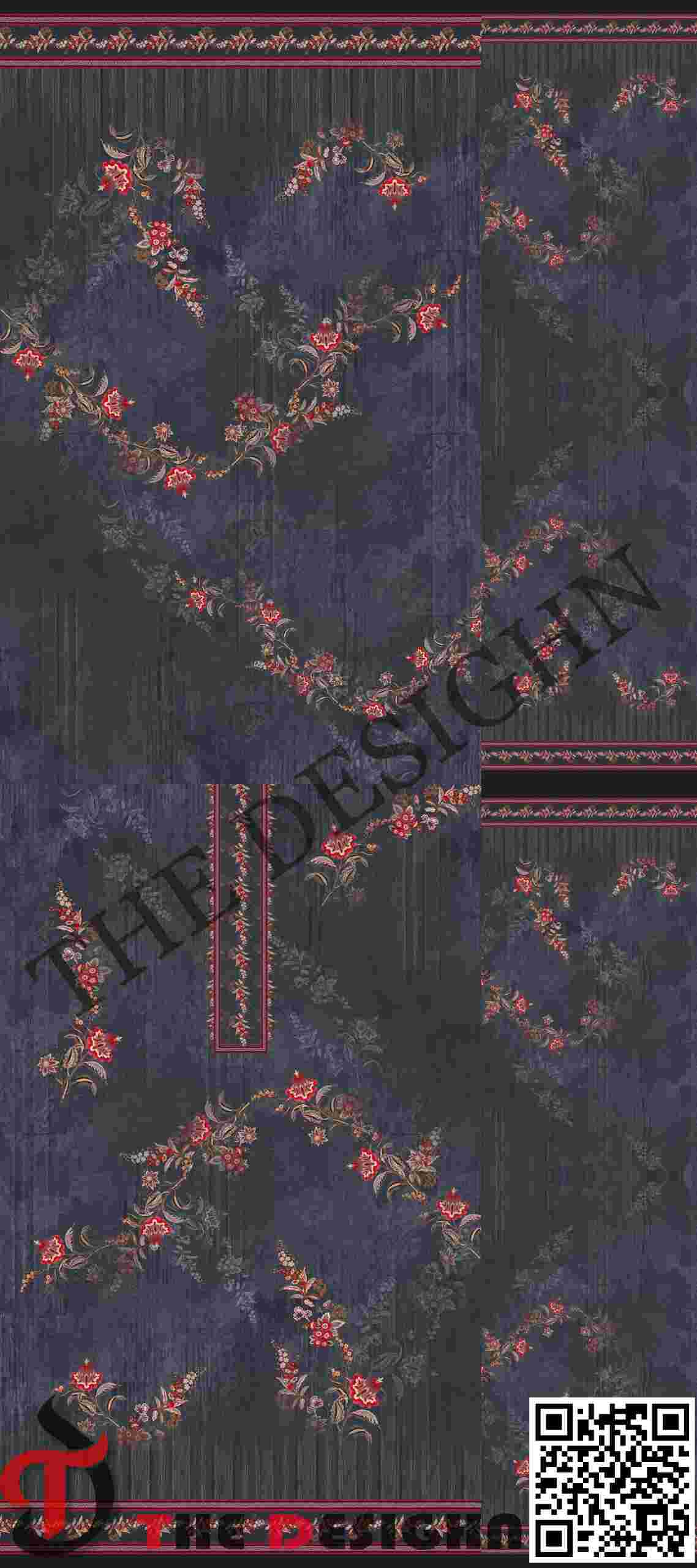 Floral Trailing (Bel): Delicate, diagonally trailing vines flow across the main field. These vines feature small, intricately detailed blossoms in garnet red and gold. The style mimics “Zardosi” or fine needlework, giving the print a luxurious, tactile feel.