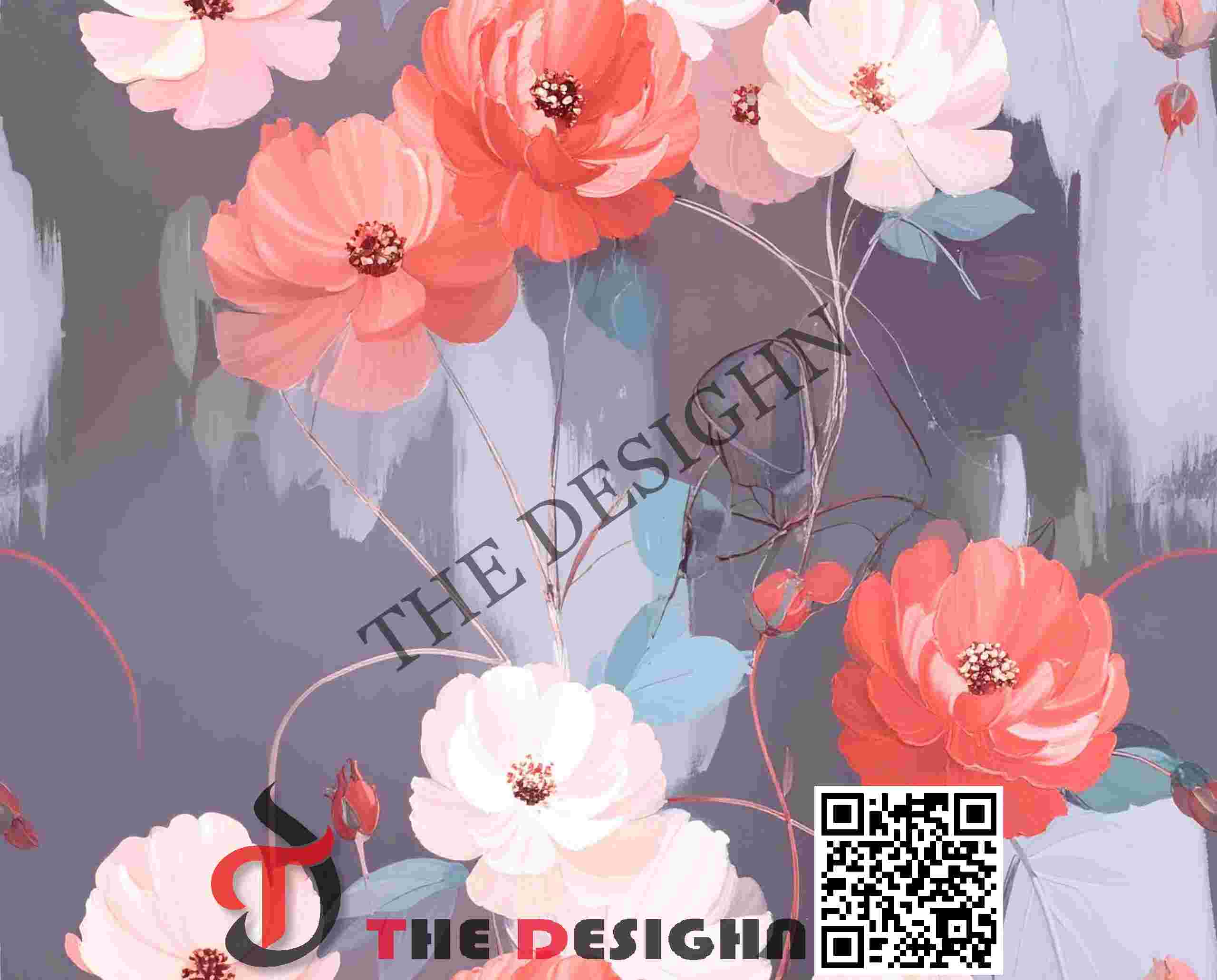Pigment Dispersion (Zonal): The design features “Friction-Dry Graduation.” Dispersion is organized by the energy of the brushstroke. The color moves from high-density, opaque “impact nodes” (the centers of the coral poppies) to light, vaporous “scumbled” edges at the petal tips, mimicking the natural loss of pigment as a brush moves across a textured mineral surface.