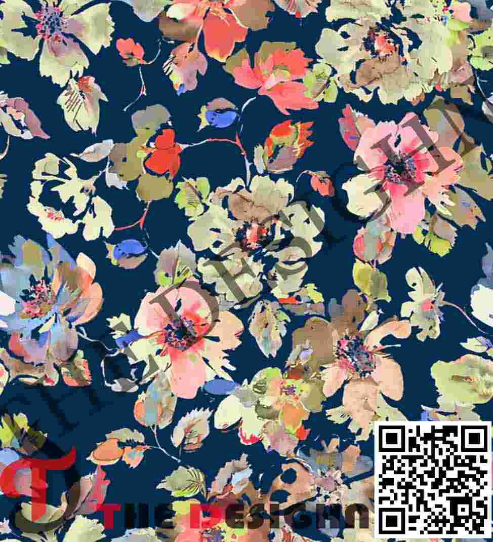 Pigment Dispersion (Zonal): The design features “Viscous Zonal Graduation.” Within the pink and beige petals, the color is dispersed in varying “densities”—from high-opacity solid strokes to thin, vaporous “dry-brush” edges where the navy ground bleeds through—mimicking the natural drag of a brush loaded with heavy paint.
