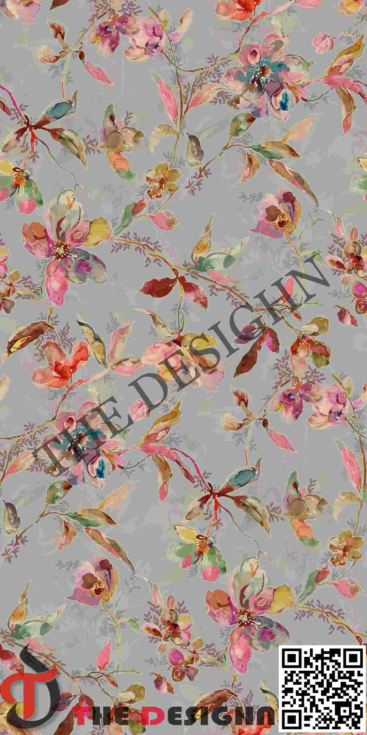 • e Look: The composition utilizes “Spectral Depth Layering.” Set against a solid, non-reflective Mist-Gray field, the design features trailing vines of multi-tonal flowers. The petals blend sapphire-blues, emerald-greens, and rubine-reds, using the natural transparency of watercolor to create volume without heavy outlines.