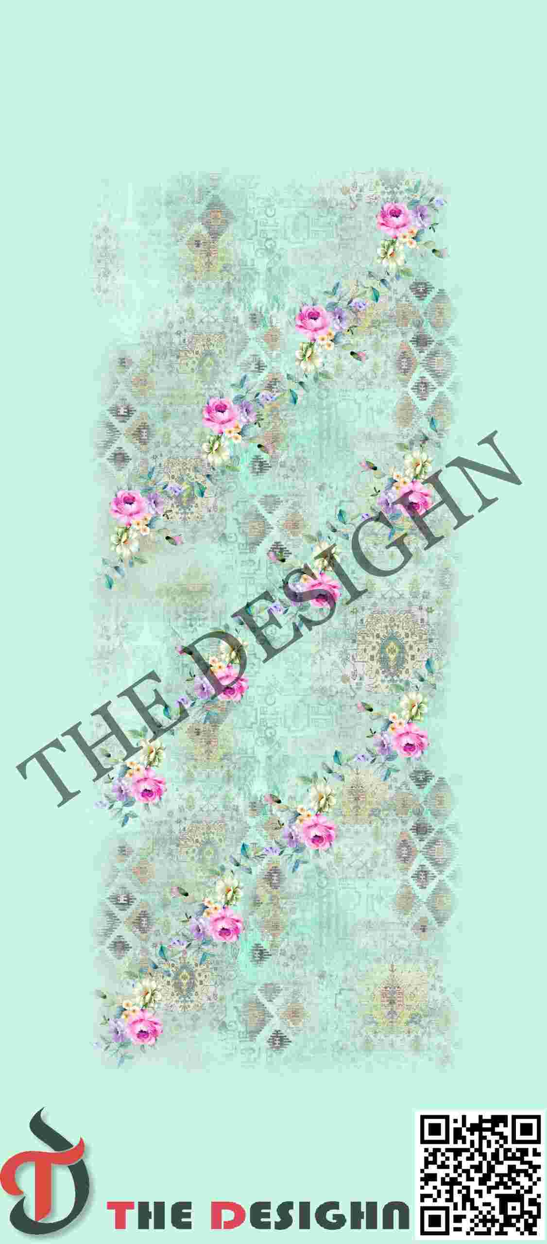 Shadow Layering: The design uses expert digital shadowing, where faint, monochromatic “ghosts” of the floral motifs appear behind the main clusters, creating a three-dimensional visual effect on the fabric.