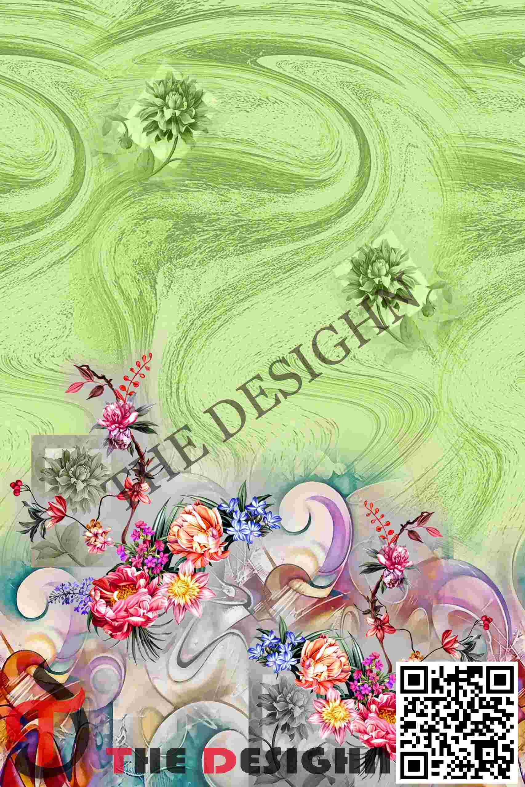 Pigment Dispersion (Graduated): The design features “Structural Tonal Bleeding”. The entire composition transitions through distinct color zones—from bright chartreuse to soft lavender—with the pigment dispersed in soft, atmospheric layers that merge through the central zone to suggest immense soft-focus depth behind the sharper flowers.