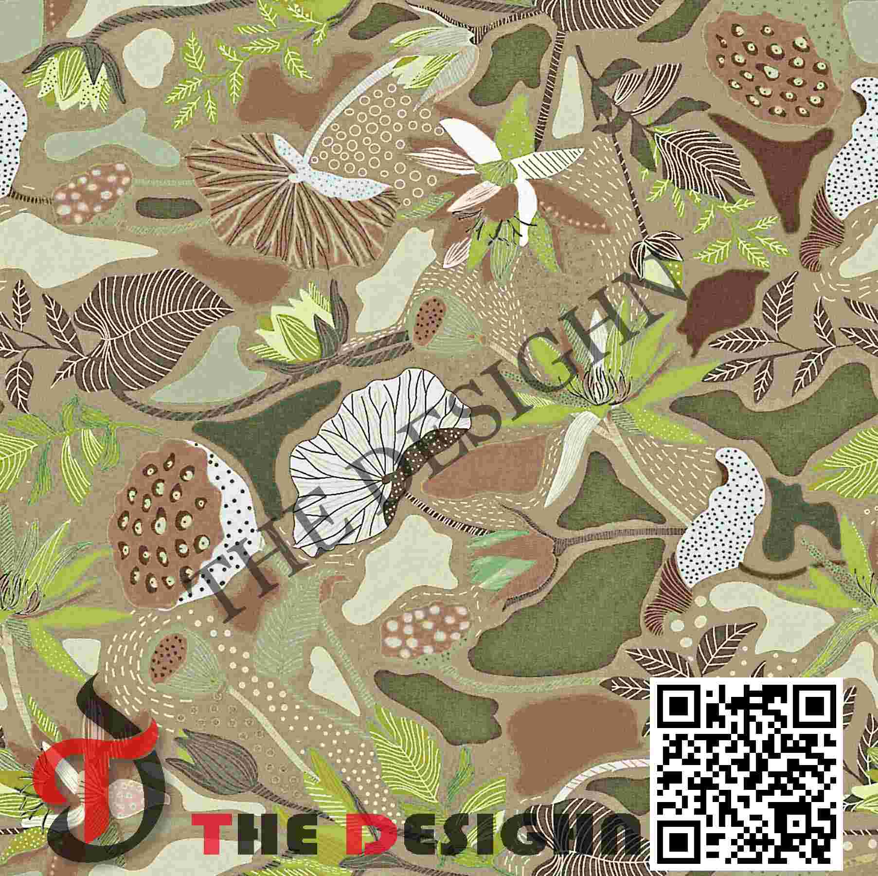 • Pigment Dispersion (Mottled): The large, organic background shapes show “Segmented Tonal Mottling.” The olive and brown pigments are dispersed unevenly within their boundaries, suggesting a hand-painted application where color has settled into simulated fabric fibers.