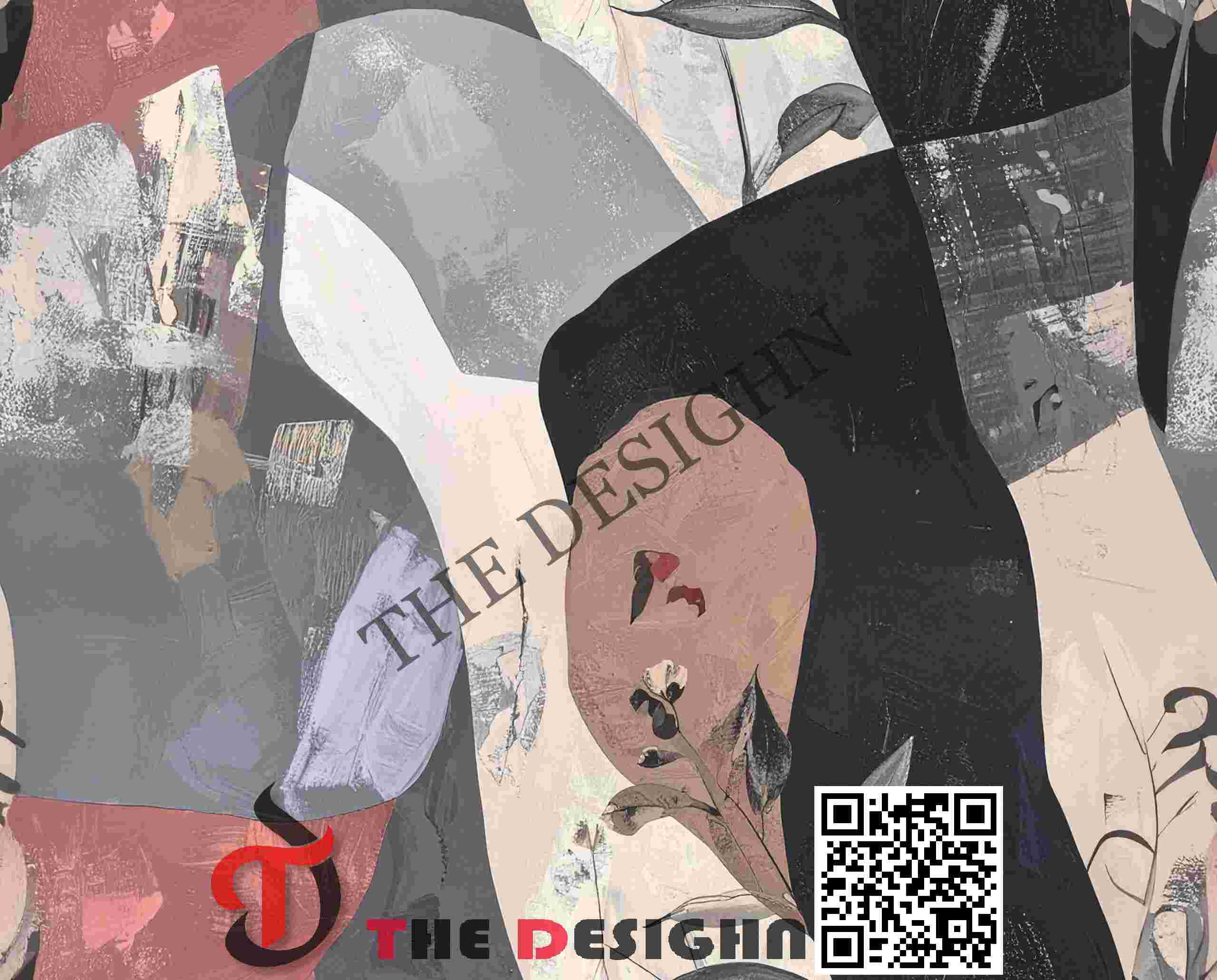 • The Look: The composition utilizes “Structural Mass Overlapping.” Set against a variegated field of Mineral-White and Ash-Gray, the design features large, flat blocks in Obsidian-Black, Slate-Blue, and Terracotta-Rose. Small, delicate botanical “specimens” appear to be trapped within or painted onto the heavy blocks, providing a singular point of naturalistic relief within the industrial field.