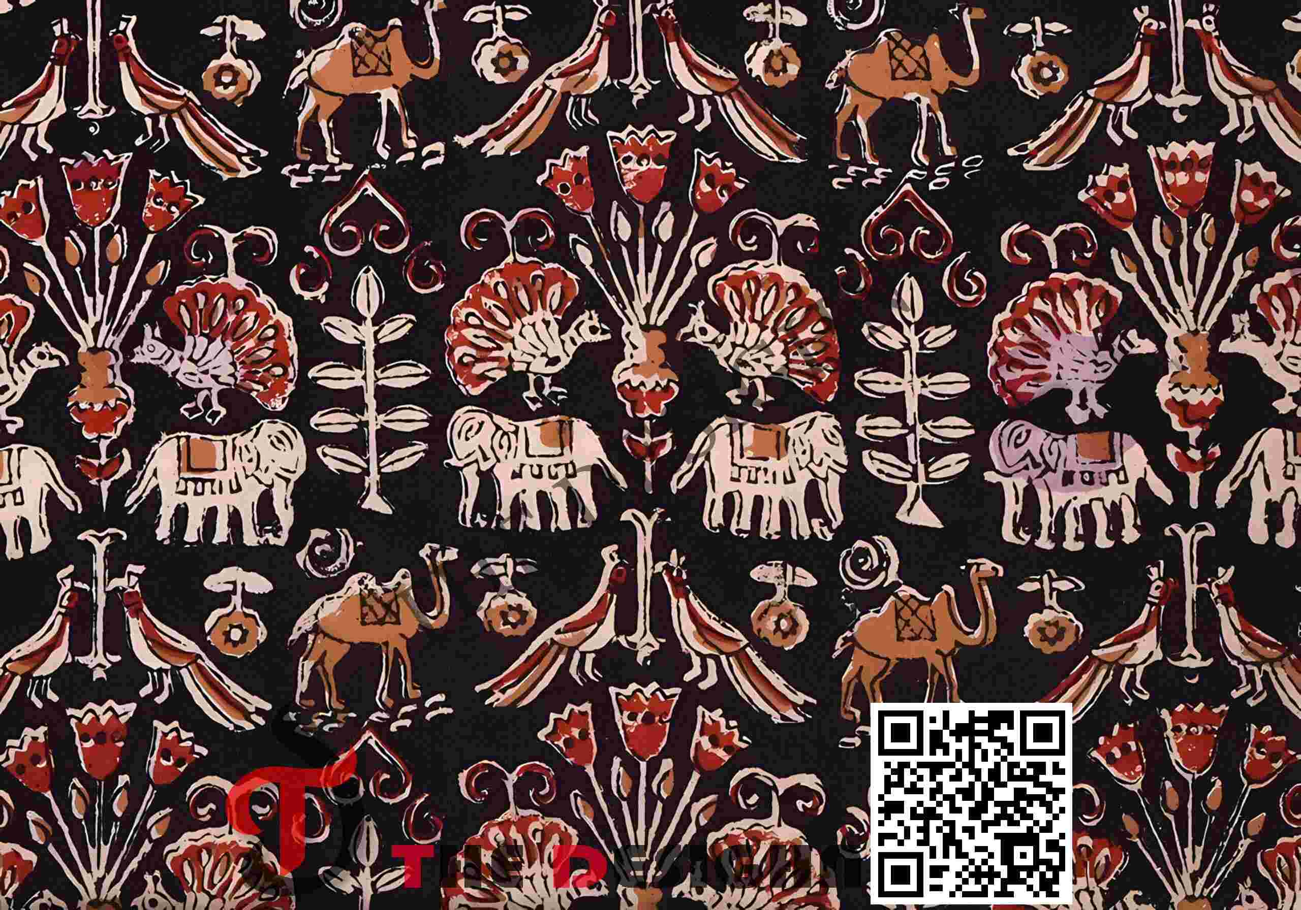 Visual Dispersion (Segmented): The primary animal and floral forms exhibit “High-Contrast Zonal Segmentation”. The color is dispersed in flat, opaque blocks (orange, cream, and red) within the motifs, suggesting an artisanal block-print technique that creates a clean, graphic surface quality.