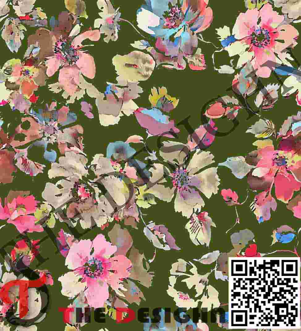 Pigment Dispersion (Zonal): The design features “Viscous Zonal Graduation.” Within the pink and beige petals, the color is dispersed in varying “densities”—from high-opacity solid strokes to thin, vaporous “dry-brush” edges where the olive ground bleeds through—mimicking the way high-viscosity paint breaks apart across a textured surface.