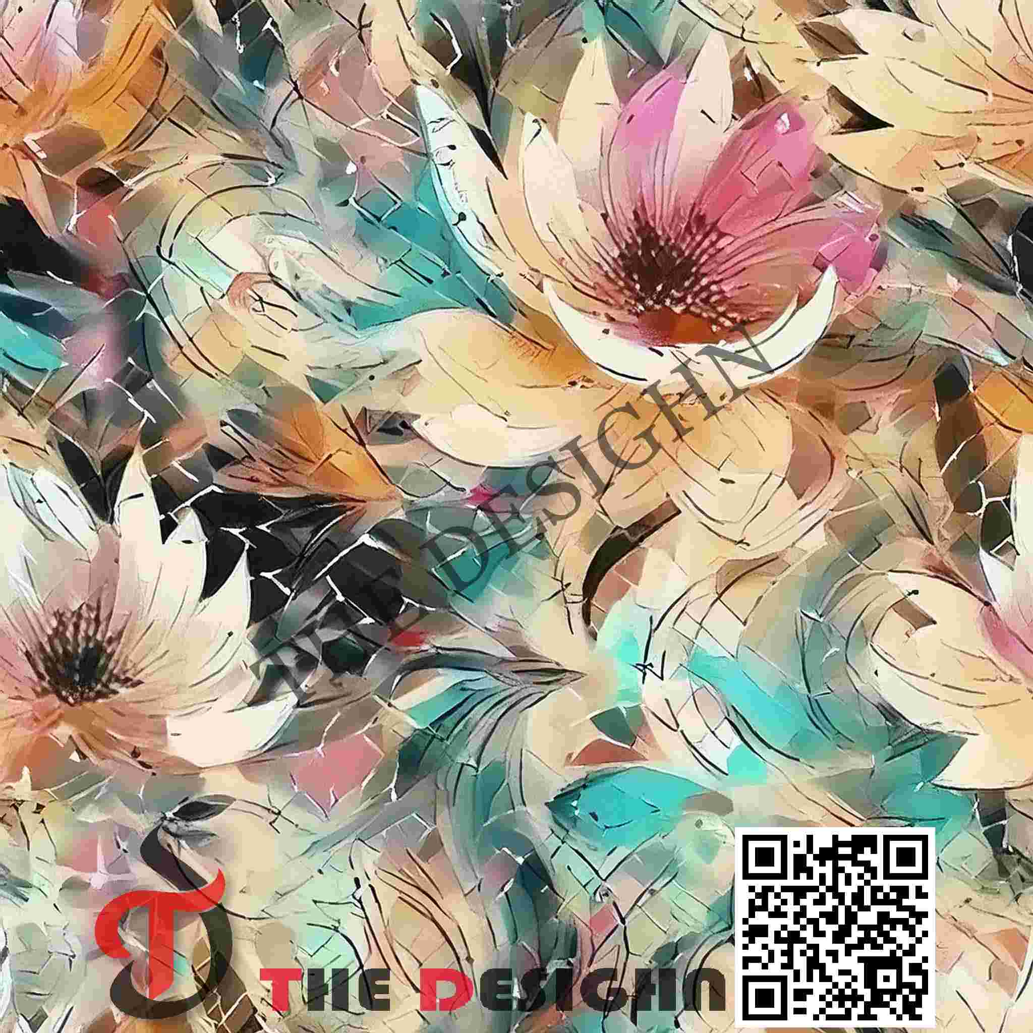 Pigment Dispersion (Segmented): The design features “Crystalline Segmental Diffusion”. Between the fracture lines, the pigments are dispersed in distinct, faceted “cells,” allowing for a high-definition transition between the warm floral tones and the cool teal background elements.