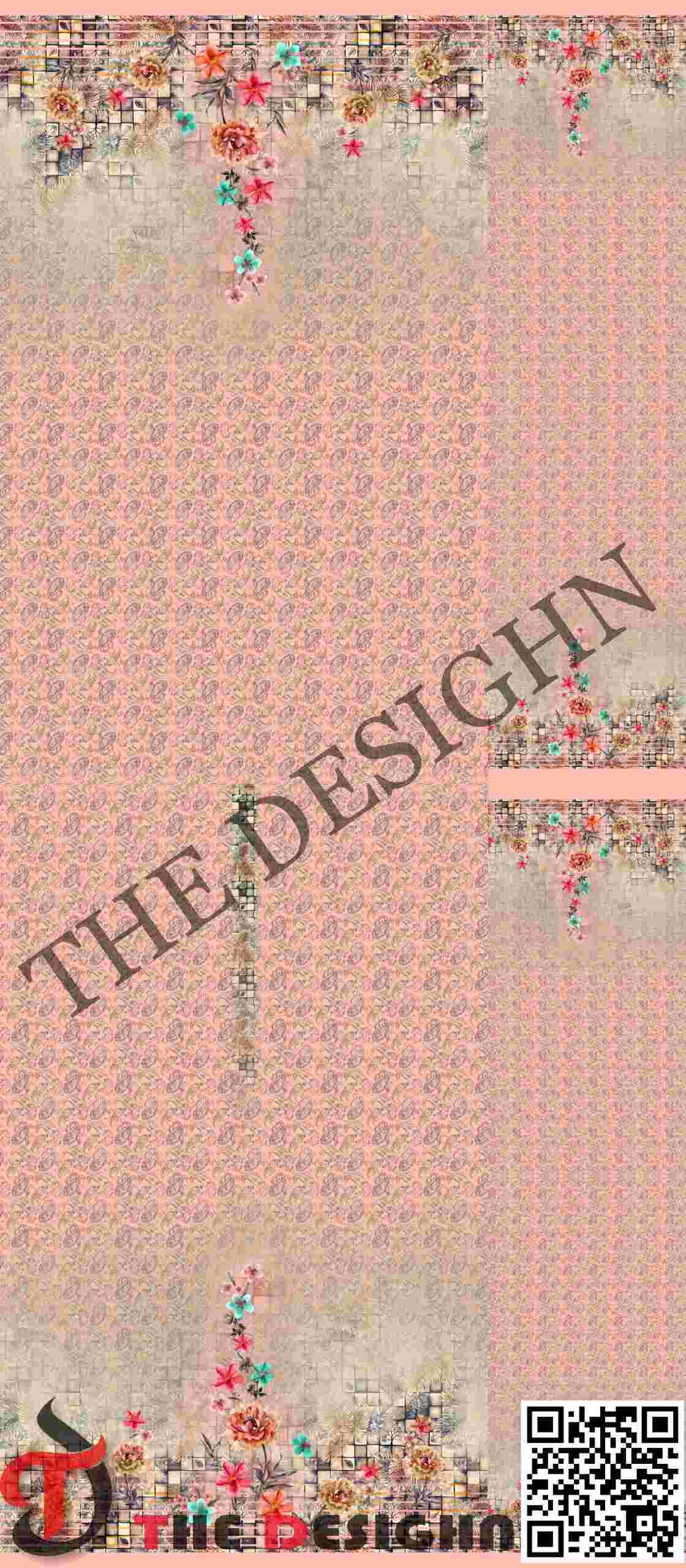 The Main Field (Allover Print): The central body is covered in a micro-paisley “buti” motif. This intricate, repeating pattern is rendered in a soft charcoal tone over a textured dusty rose background, providing a rich, fabric-like visual depth similar to fine linen or lawn.