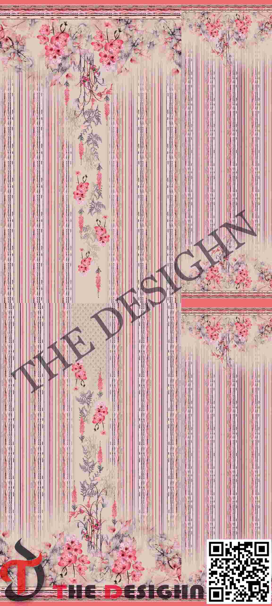 Coordinated Sleeves: The panels on the right showcase the sleeve designs, which maintain the pinstripe frequency and include a proportional version of the main floral border.