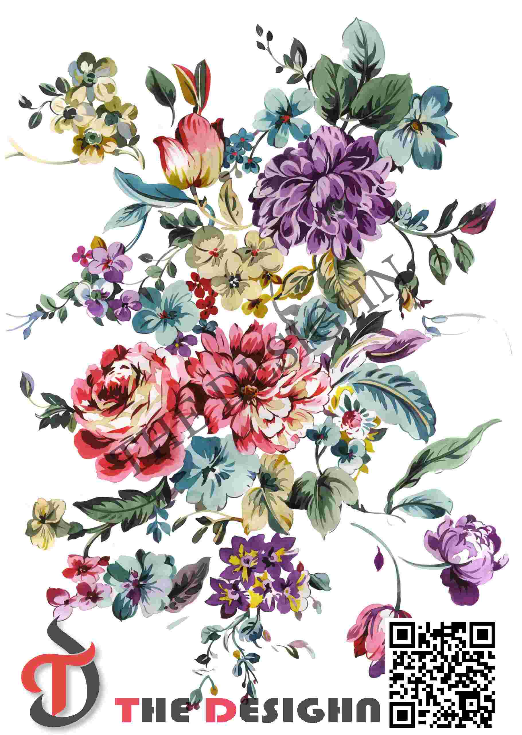 • he Look: The composition utilizes “Central-Weighted Scaffolding.” Set against a brilliant Mineral-White field, the design centers on a large coral-pink bloom, surrounded by deep amethyst dahlias and sage-green foliage. The use of fine “negative-space” veining on the leaves provides a structural “spine” to the lush, aqueous forms.