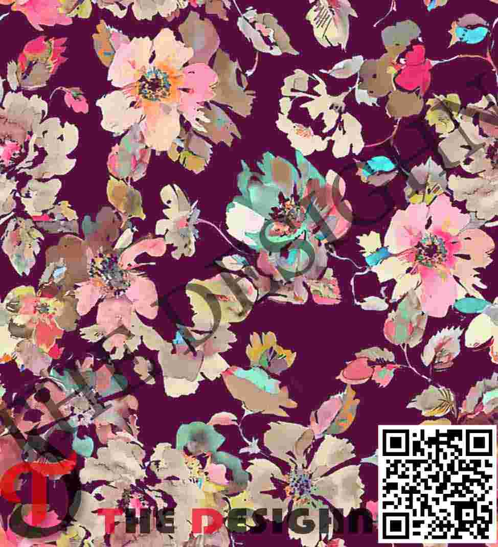 Pigment Dispersion (Zonal): The design features “Viscosity Graduation.” Within the mint and pink petals, the color is dispersed in varying “densities”—from high-opacity solid strokes to thin, vaporous “dry-brush” edges where the plum ground bleeds through—mimicking the way high-viscosity paint breaks apart across a textured surface.