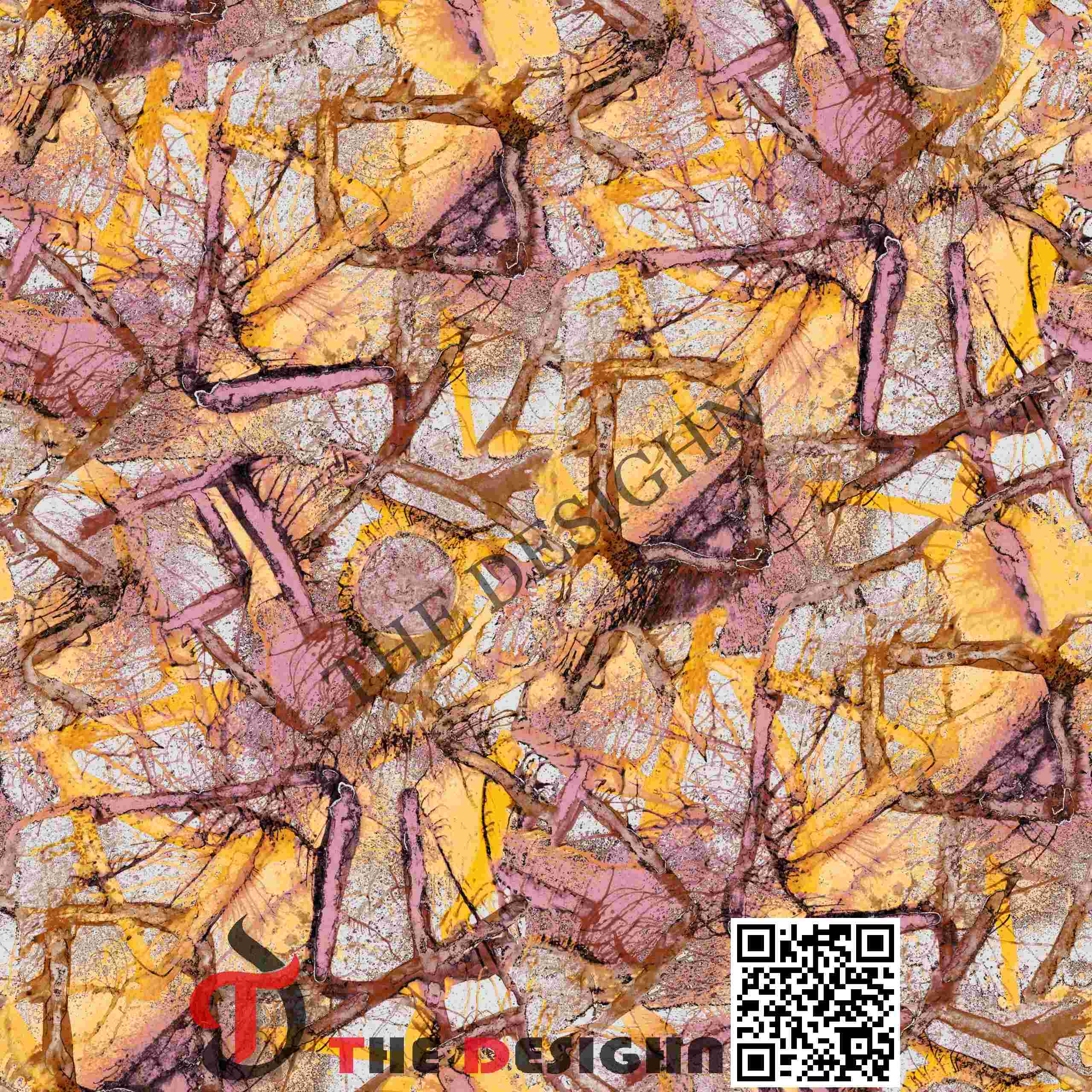 Edge Dispersion (Jagged-to-Sharp): The boundaries of the main forms feature “Shattered Linear Dispersion”. There are no smooth outlines; instead, every color zone is interrupted by jagged brown “fractures” that mimic the physical behavior of paint being dragged across a rough, weathered surface.