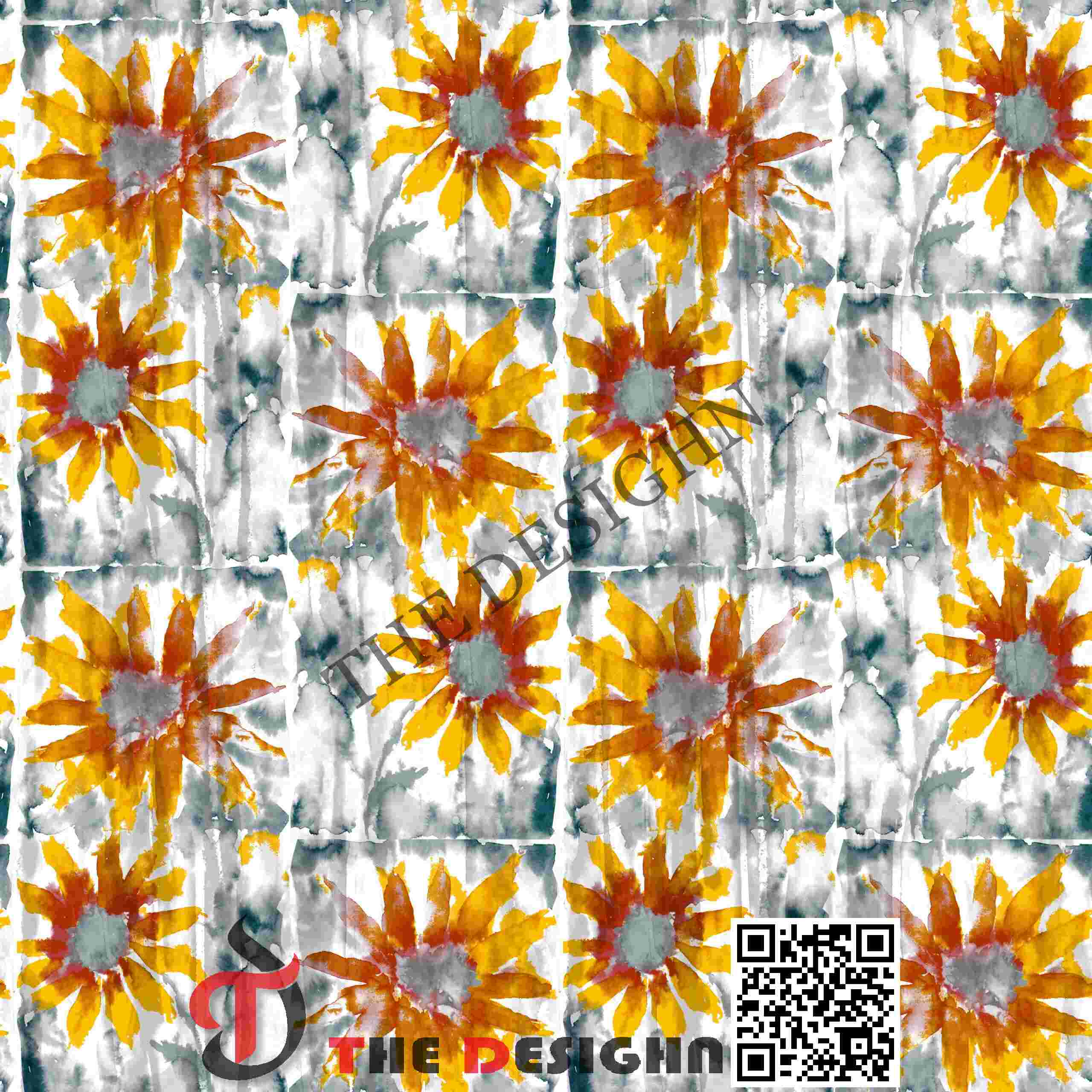 Pigment Dispersion (Mottled): The design features “Internal Wash Mottling”. Within the saffron petals and the grey floral hearts, the pigment is dispersed unevenly, revealing subtle “pooling” textures and tonal shifts that provide a tactile, hand-painted surface quality.