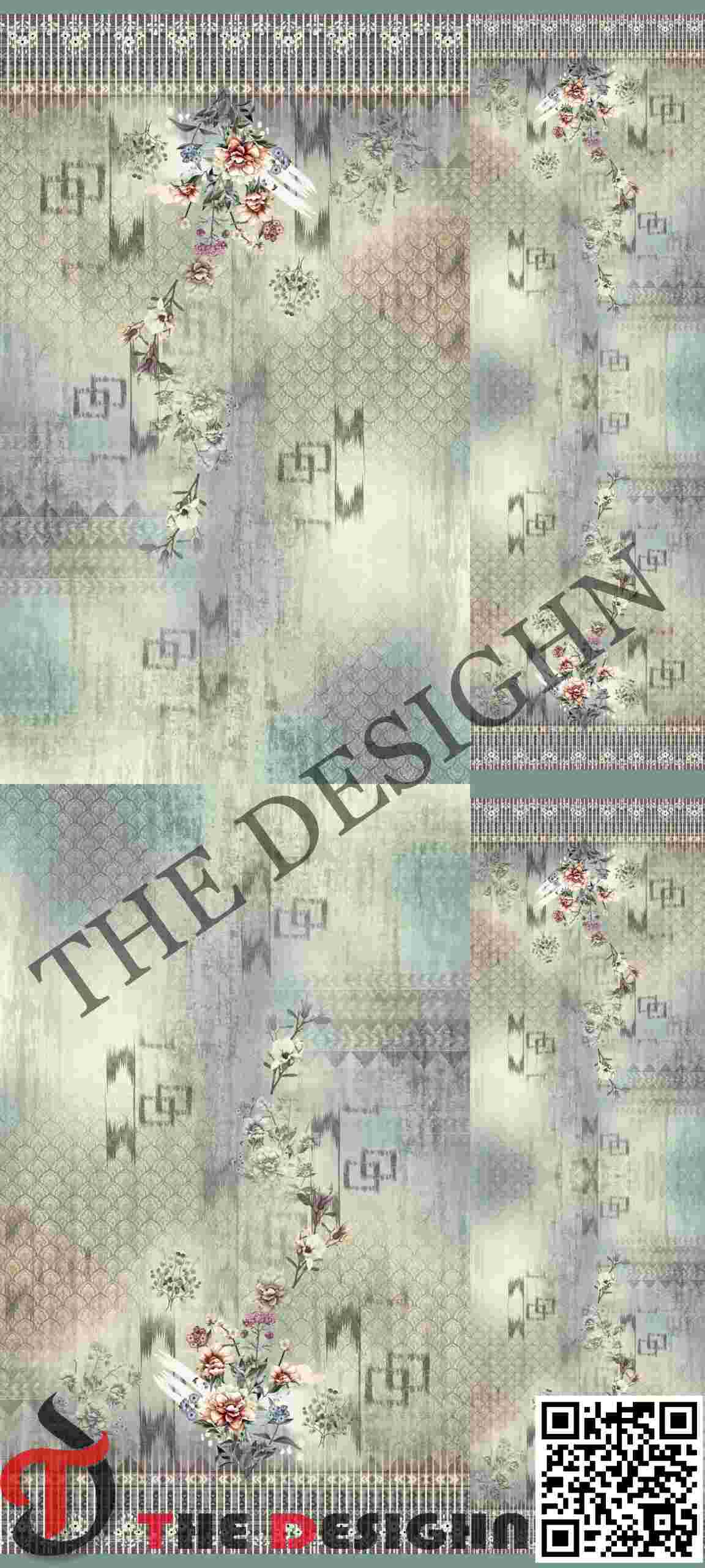 The Ground Field: The backdrop is a complex sage green and grey ombre featuring a heavy “distressed” or “weathered” overlay. It combines vertical rain-streak textures with faint, ghosted damask jaal (mesh) motifs, providing a rich visual depth similar to antique wallpaper.