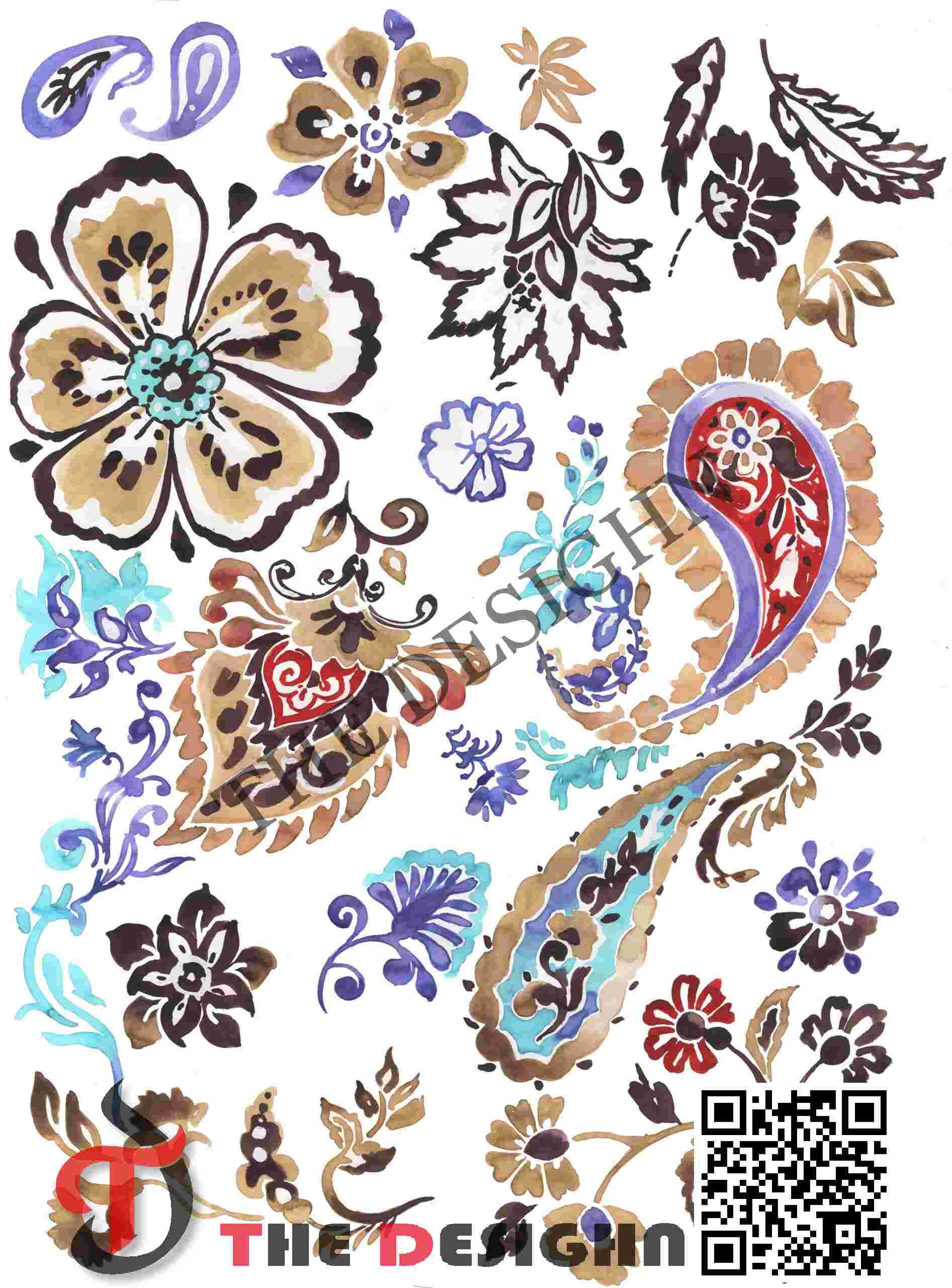 • Key Feature: Filigree Scaffolding: Depth is achieved through “Contour Scaffolding”—where the thick, dark-charcoal outlines of the petals and paisley ribs act as structural containers, organizing the fluid watercolor fills and creating a sense of hand-pressed relief.