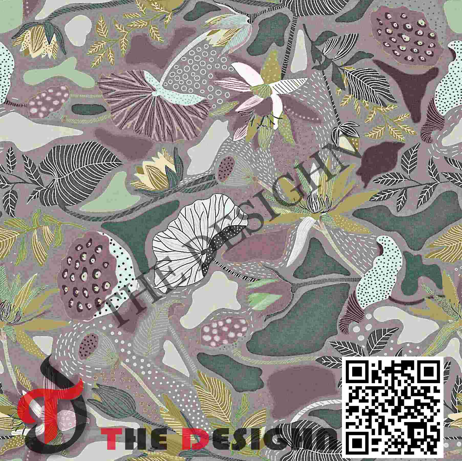 Pigment Dispersion (Mottled): The large, organic background shapes show “Segmented Tonal Mottling.” The lavender and grey pigments are dispersed unevenly within their boundaries, suggesting a hand-painted application where color has settled into the simulated fabric fibers.